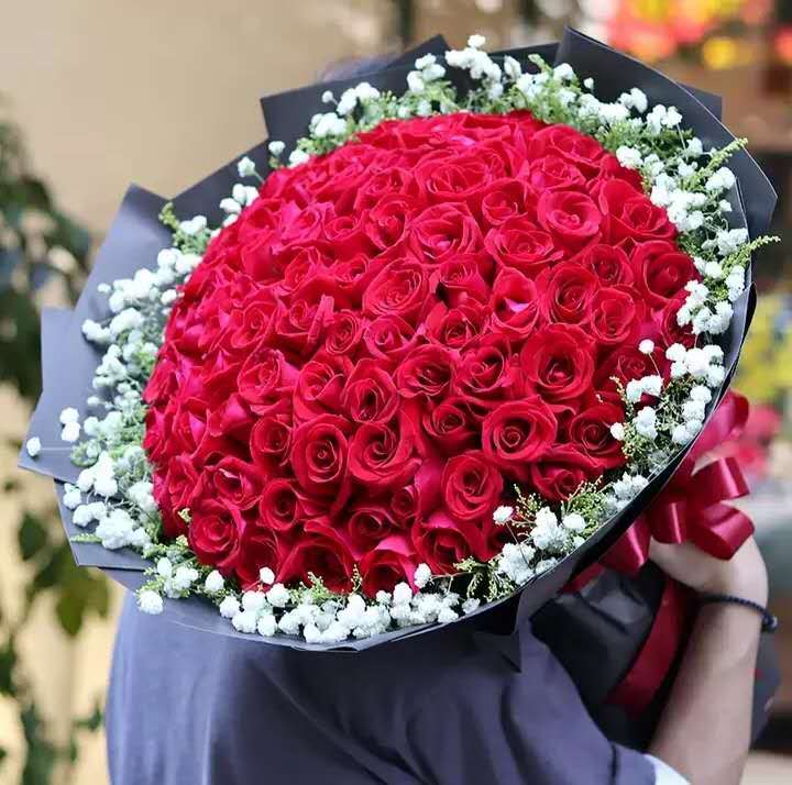 花材: 99支红玫瑰,满天星,黄莺搭配