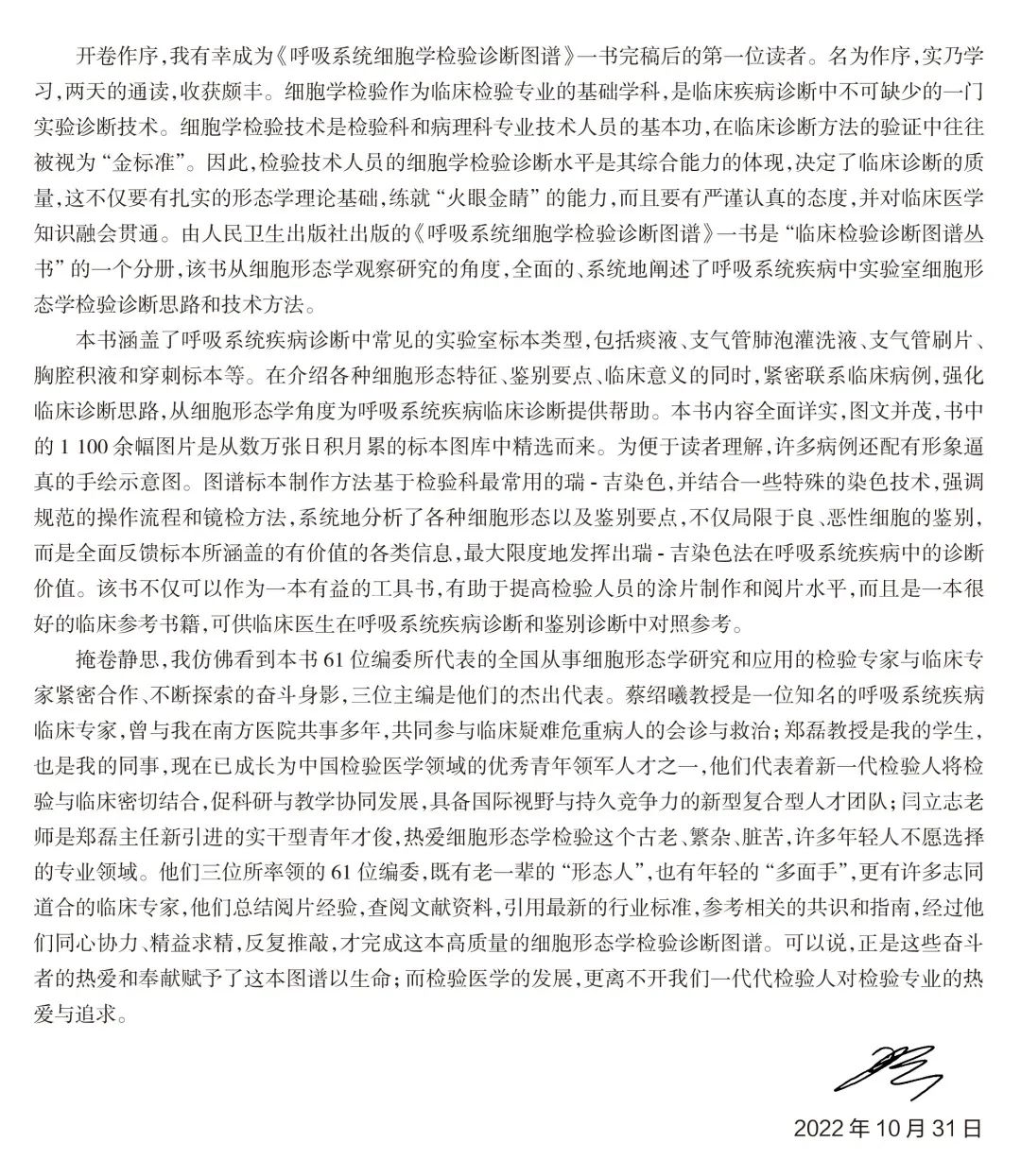 本书共7个章节,涵盖了痰液、支气管肺泡灌洗液、气管刷片、胸腔积液以及其他呼吸道标本,基于瑞-吉染色,同时结合多种其他染色技术,对呼吸系统各种细胞的形态特征、鉴别要点及检验临床意义都进行了详尽的阐述。本书内容全面、图文并茂,从几万张图片中精选1100余张有代表性的高清图片,每张图片附有简要的文字说明,使读者能够更好地掌握各种细胞的形态特征。本书实用性强,强调制片、染色及培养良好阅片习惯的重要性,规范操作以保证检验质量;在细胞形态分析方面,强调理论与实践相结合,检验与临床相结合,全面、准确地反映标本所涵盖的信息,从细胞学角度给出实验室诊断并提出合理化诊疗建议。