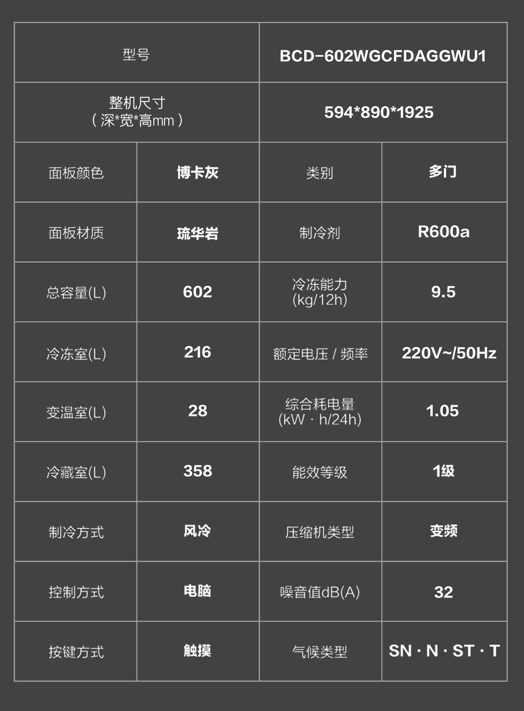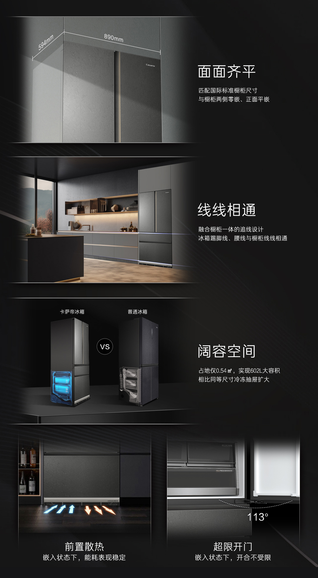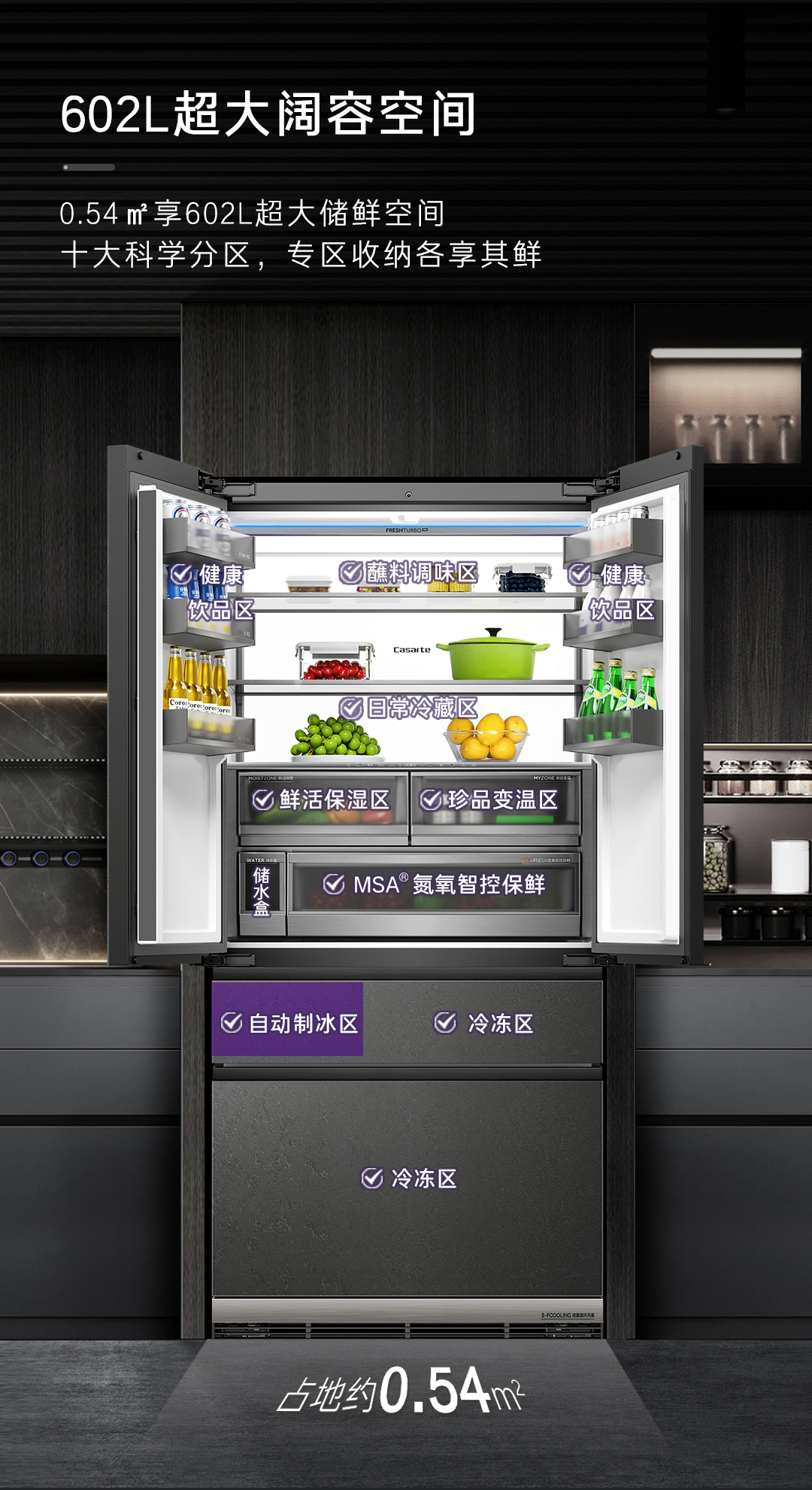 卡萨帝冰箱BCD-602WGCFDAGGWU1 原创平嵌| MSA氮氧智控|智慧动态除菌全自动制冰机|人感+显隐光感灯|智能WIFI