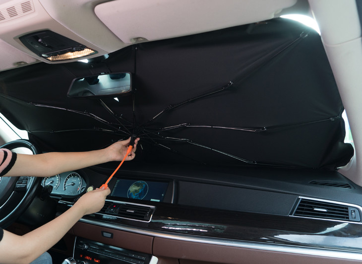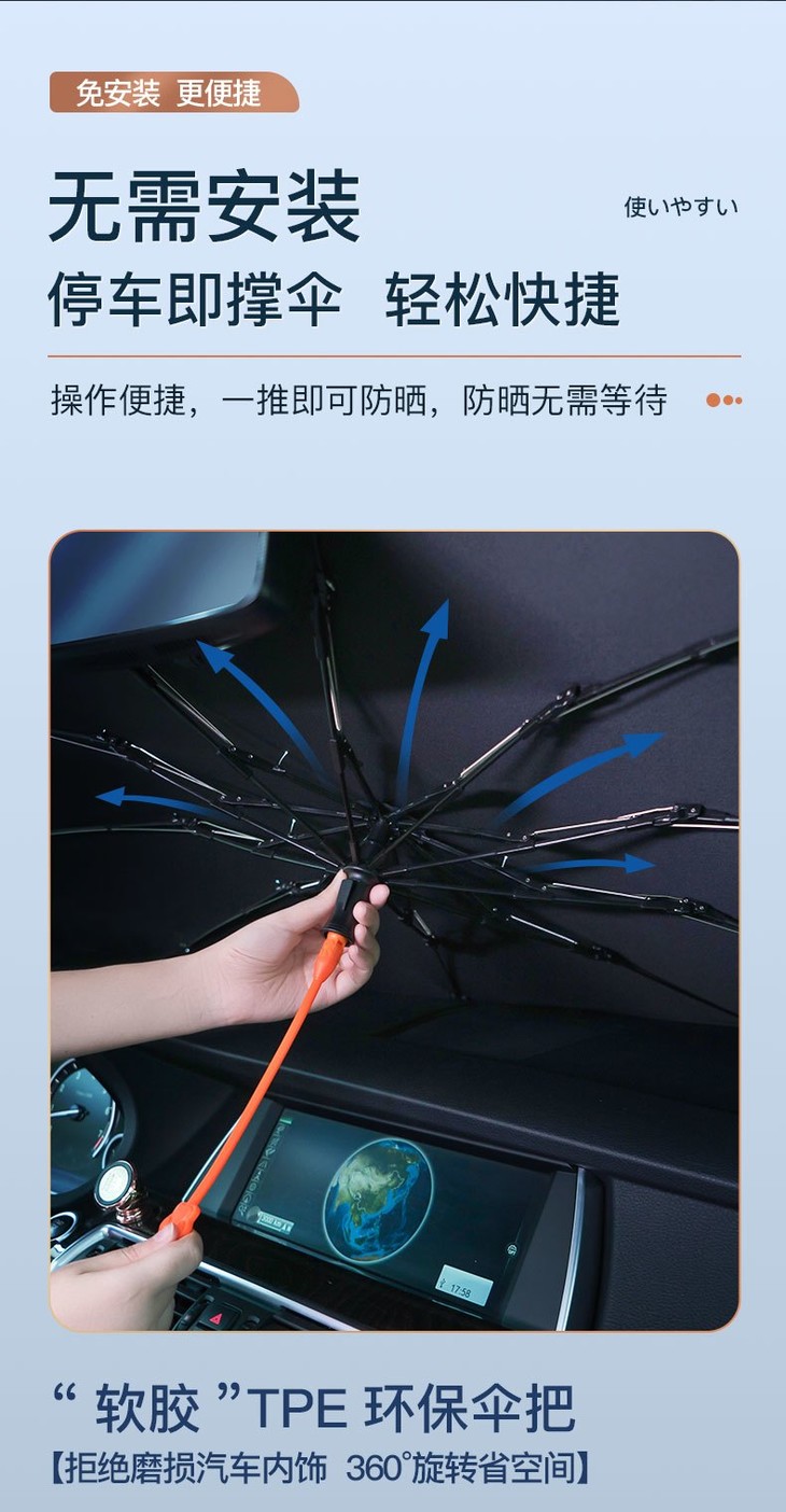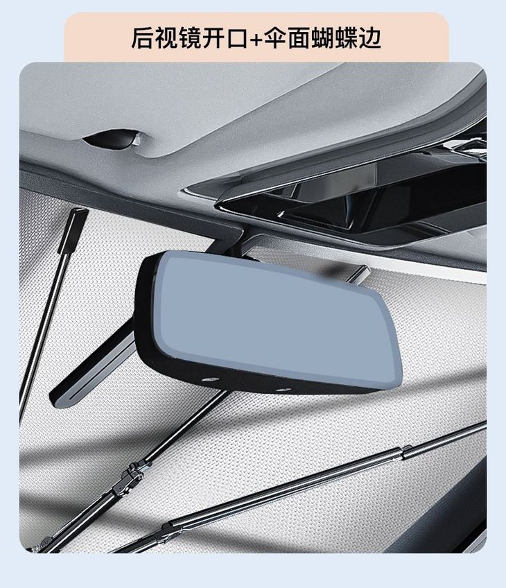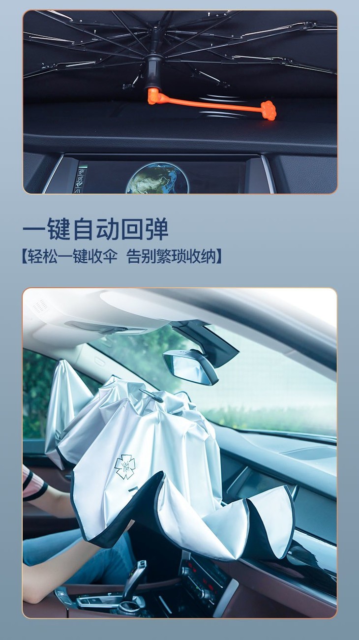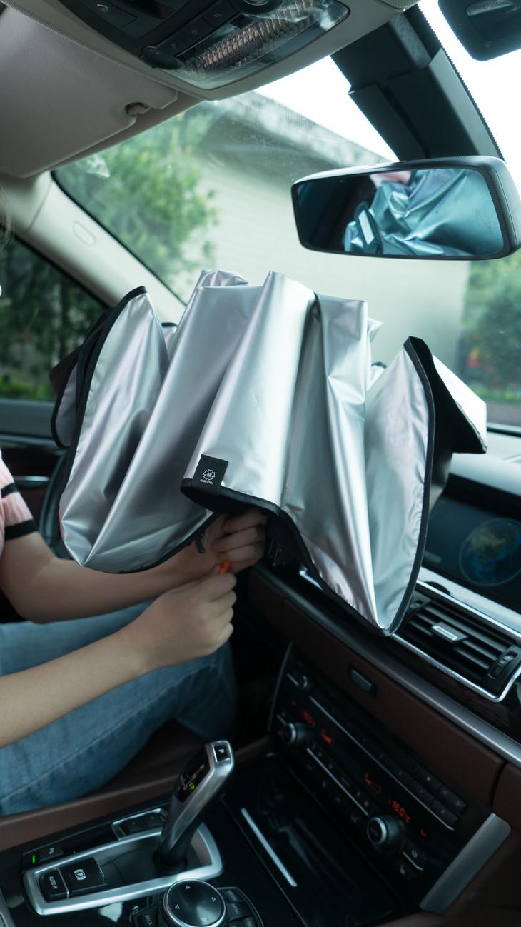 💁🚗汽车遮阳伞的使用方法很简单,车停好下车前在车内注意好角度打开它,直接放在挡风玻璃上就行 再将前座两边的遮阳镜放下来压住它就装好了,女生也可以轻轻松松的开合~ 带有弧度的伞架让整个碰击布伞面呈现曲线的凹面,不仅最大化的贴合车头玻璃,也扩大了反射紫外线及热能的效果, 遮盖力度妥妥的,车内外看它都是挡得服服帖帖