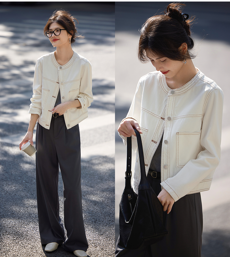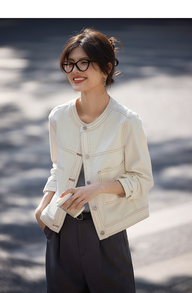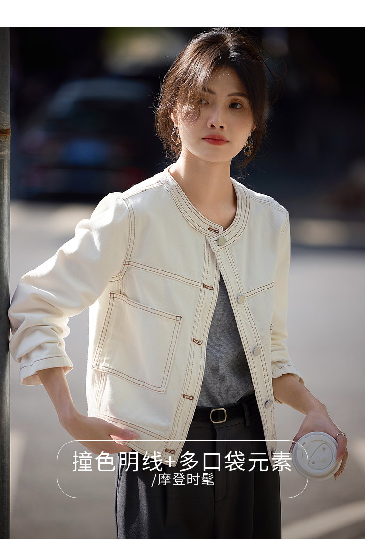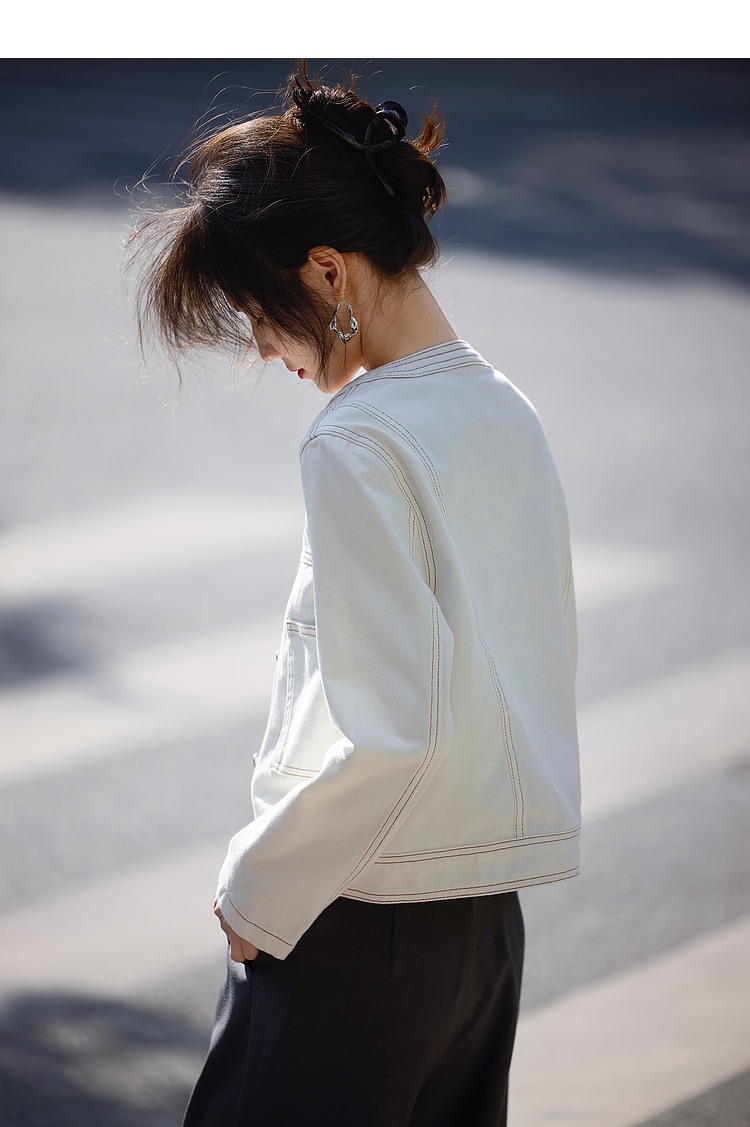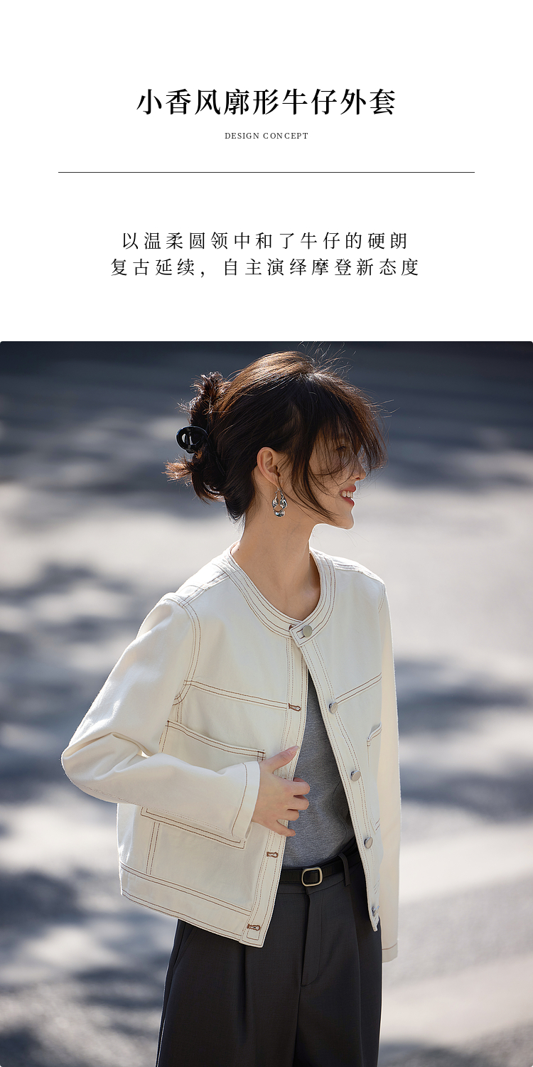 【春夏新品】熙世界小香风白色牛仔外套女2025春装新款重工明线短款夹克上衣