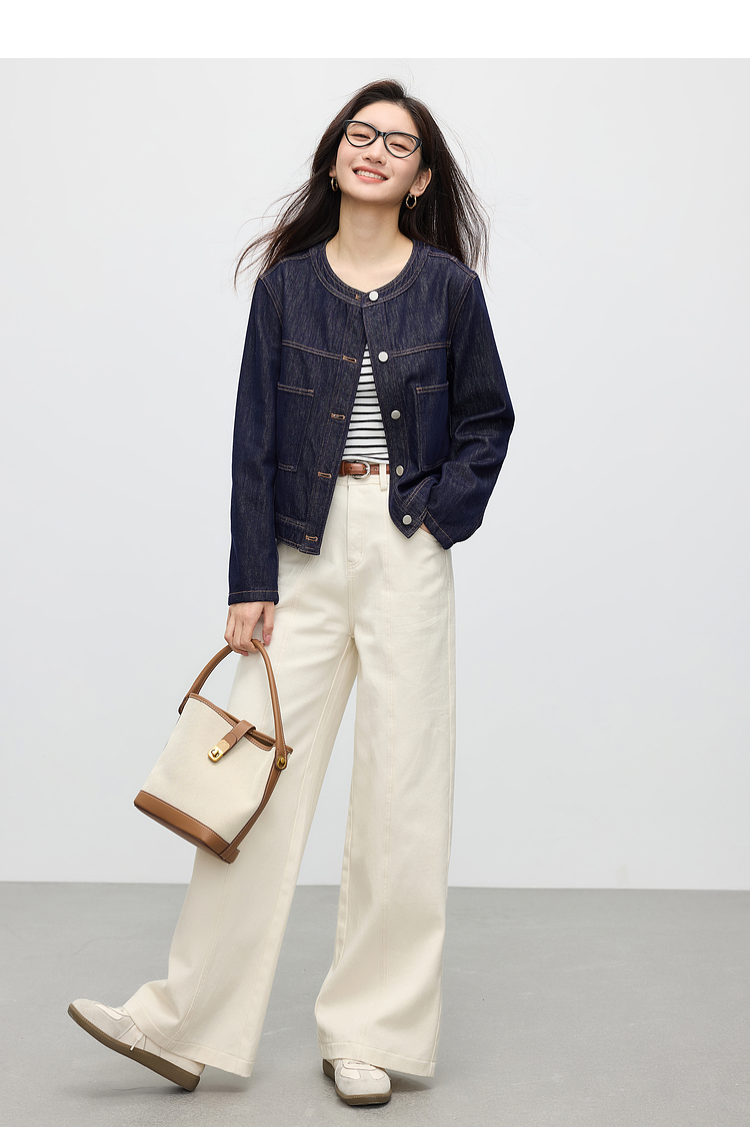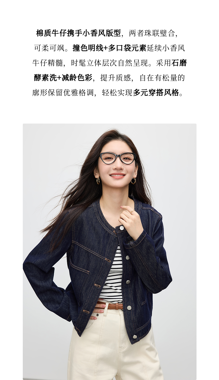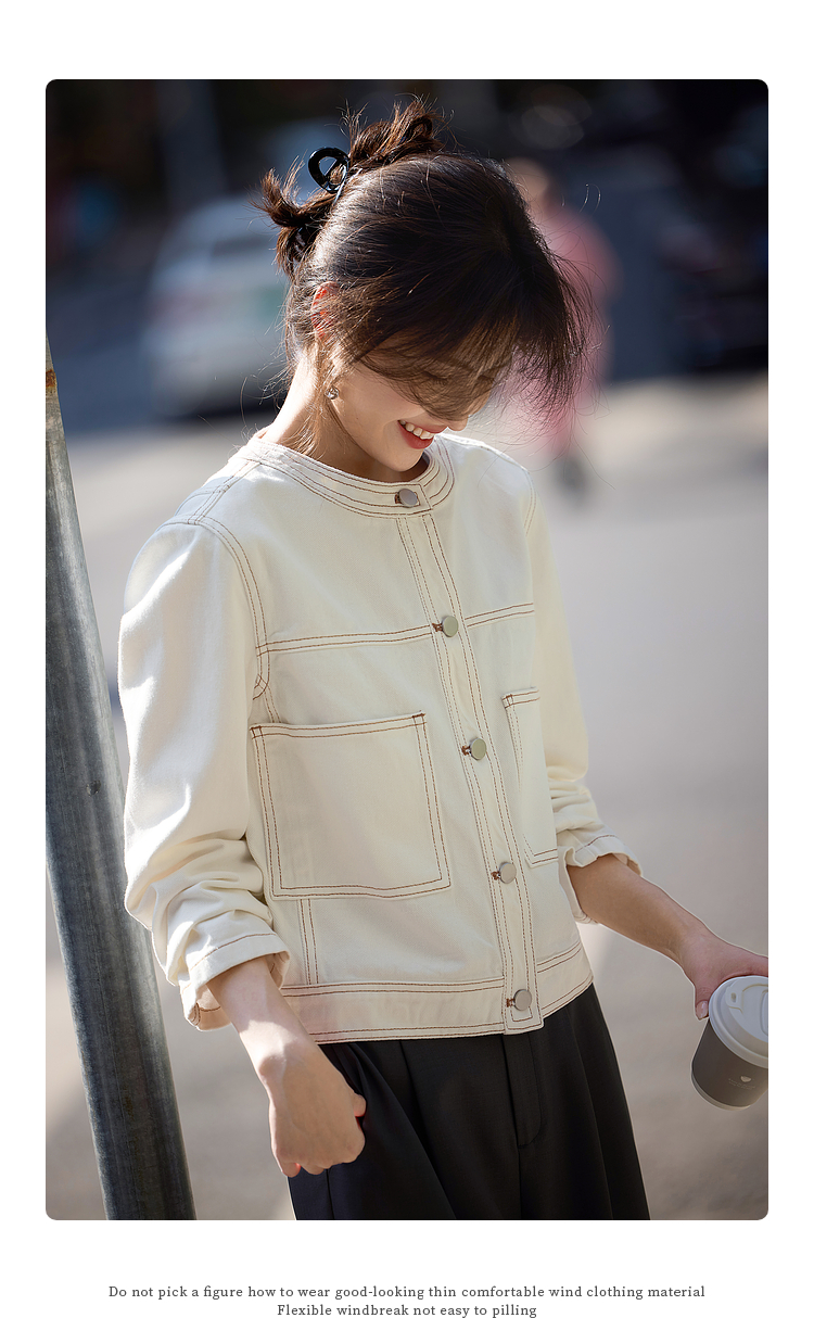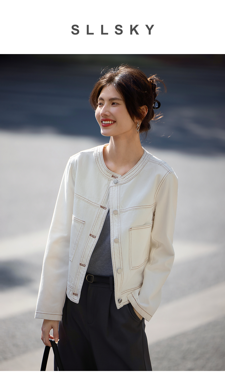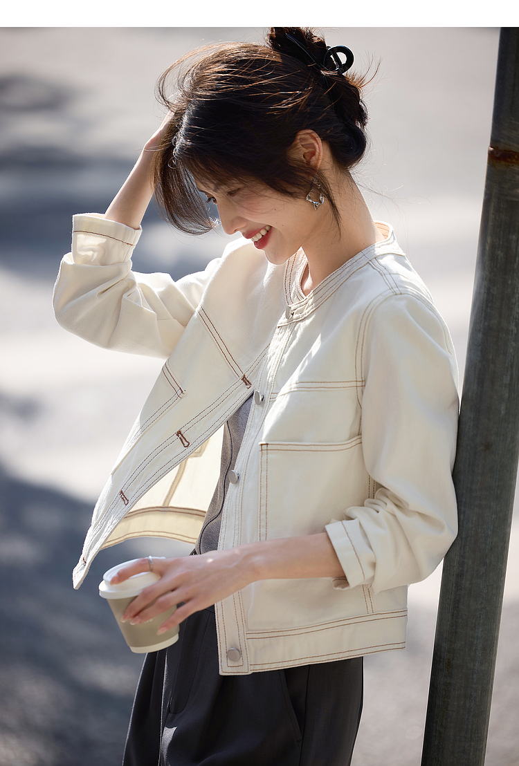 【春夏新品】熙世界小香风白色牛仔外套女2025春装新款重工明线短款夹克上衣