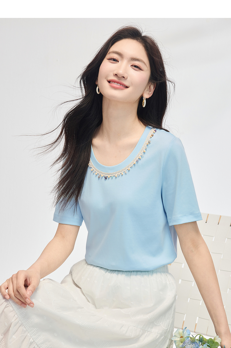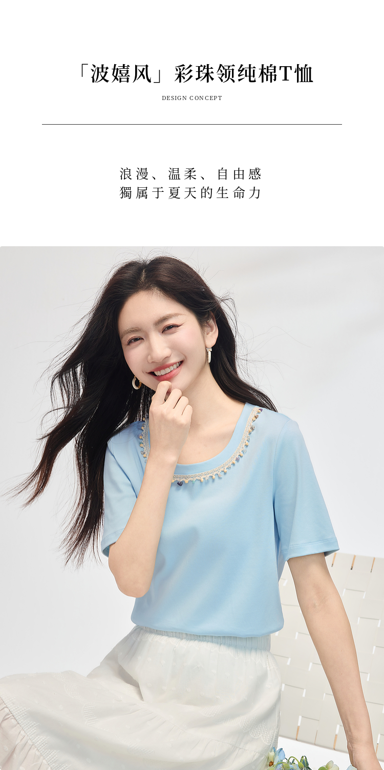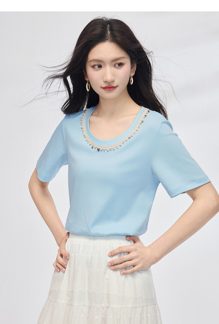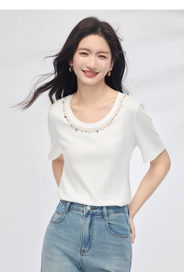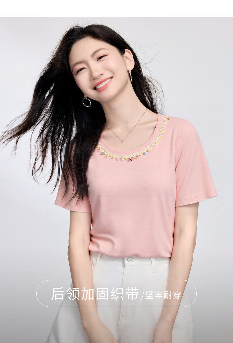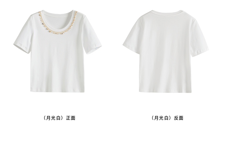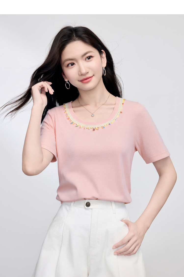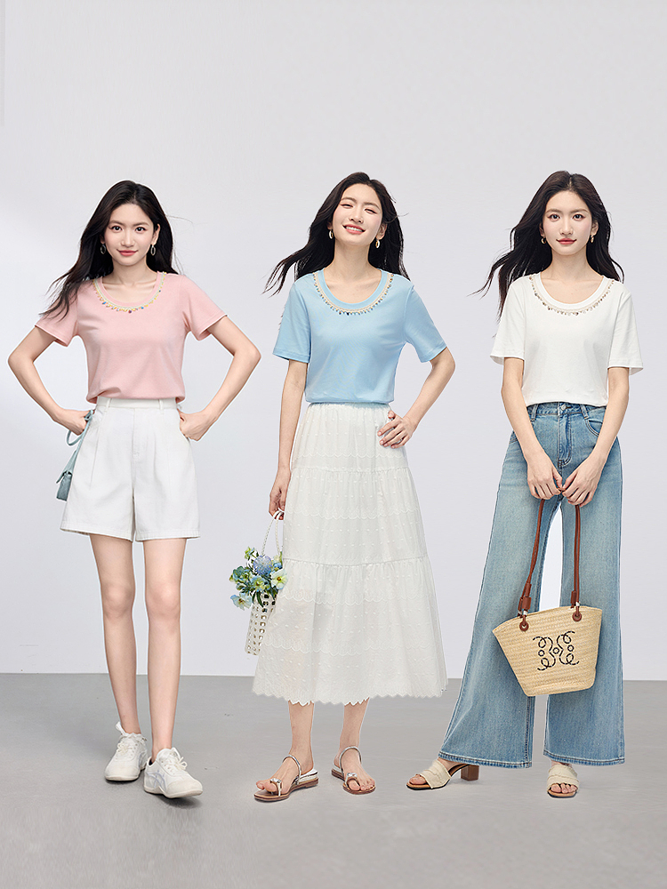 【五折购】熙世界彩珠圆领短袖T恤女设计感休闲百搭体恤棉上衣2025夏天新款