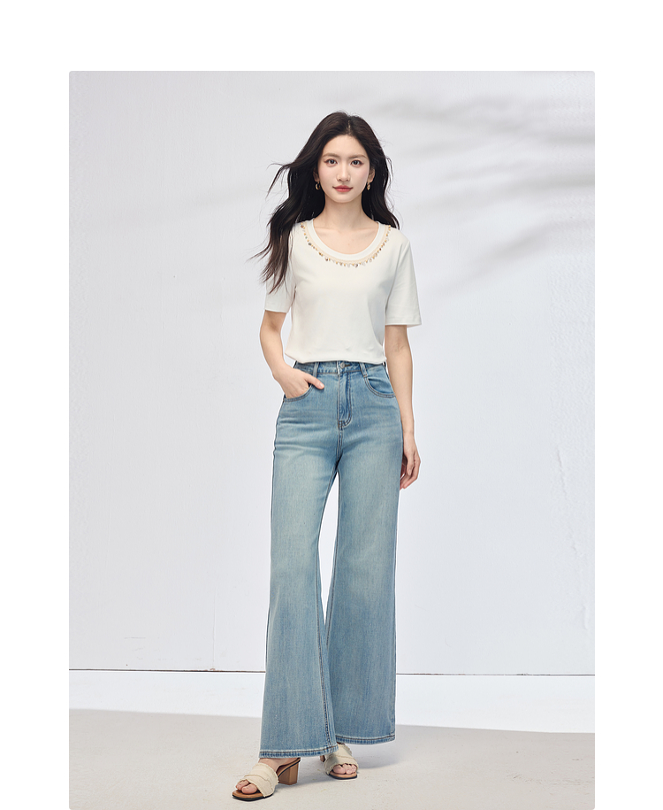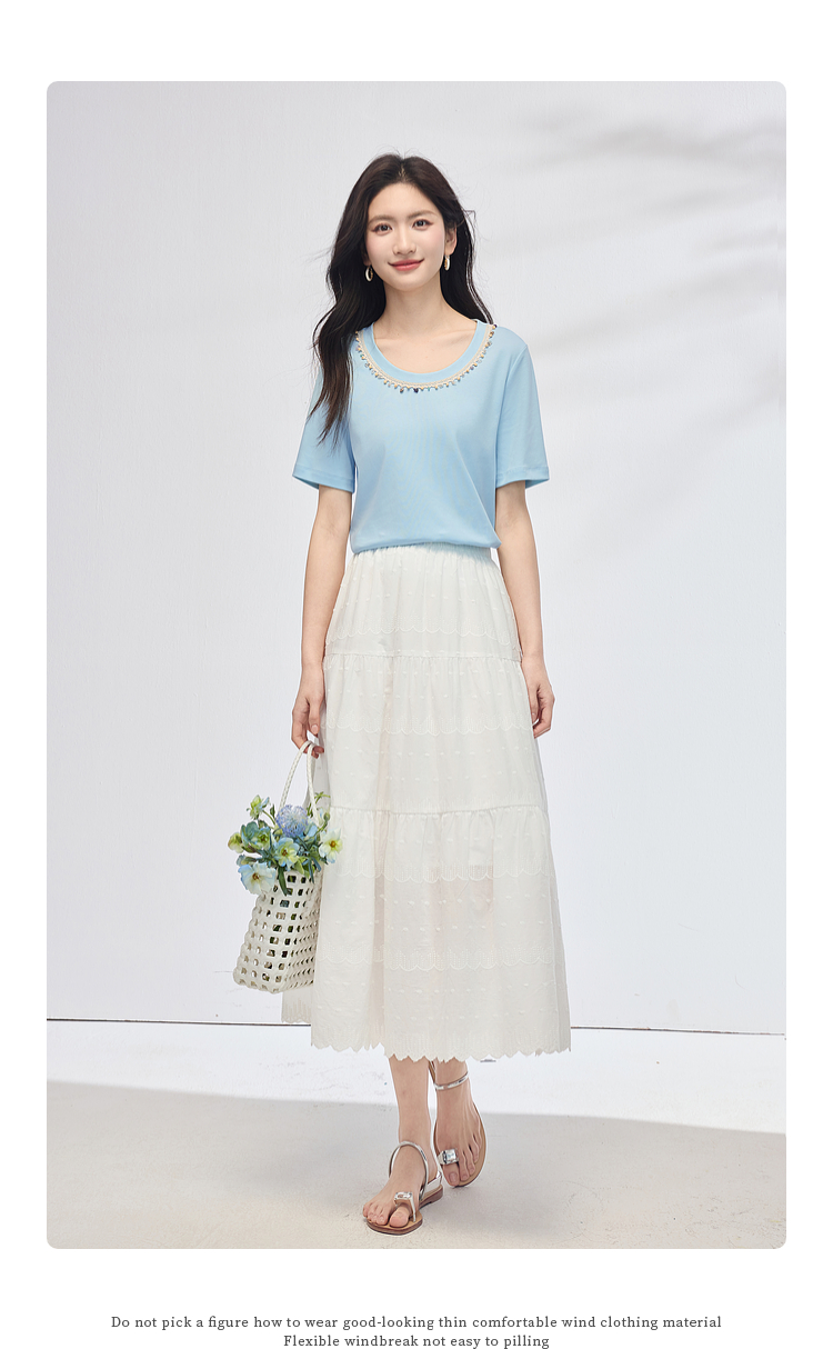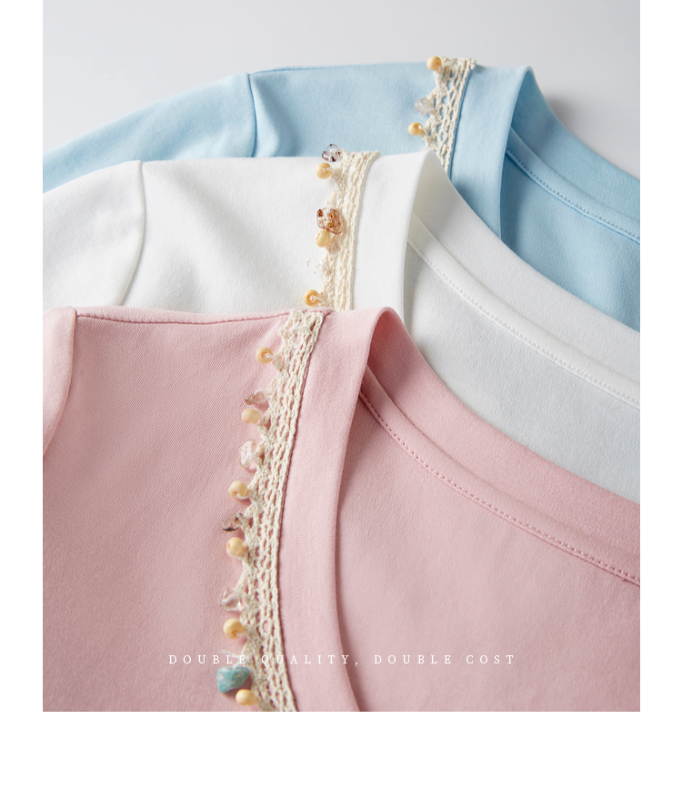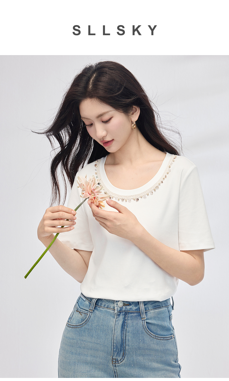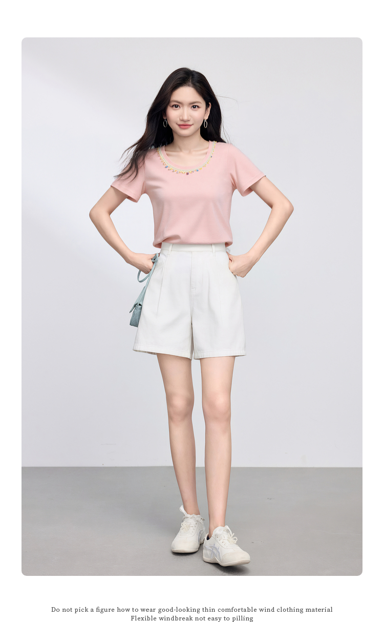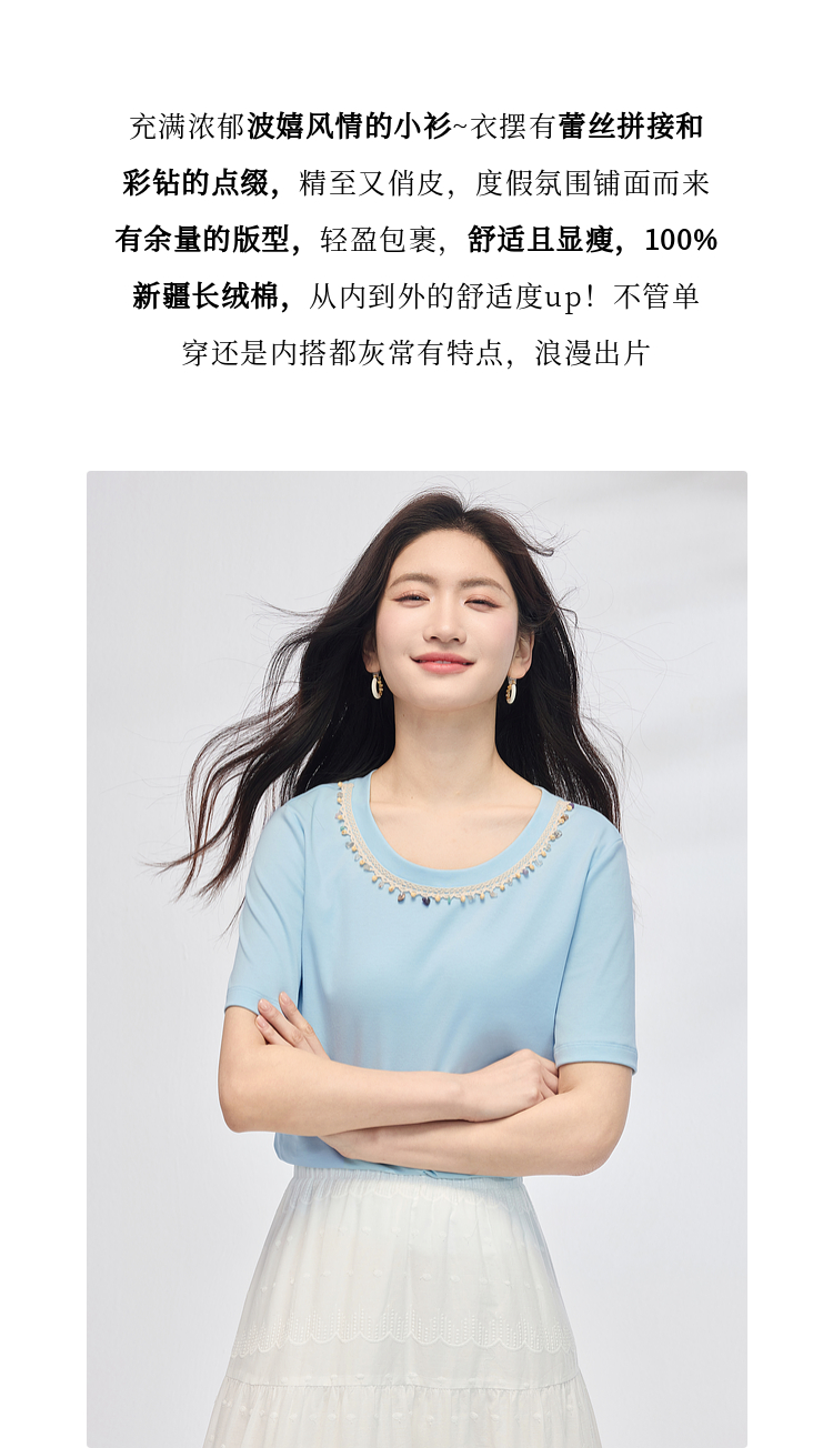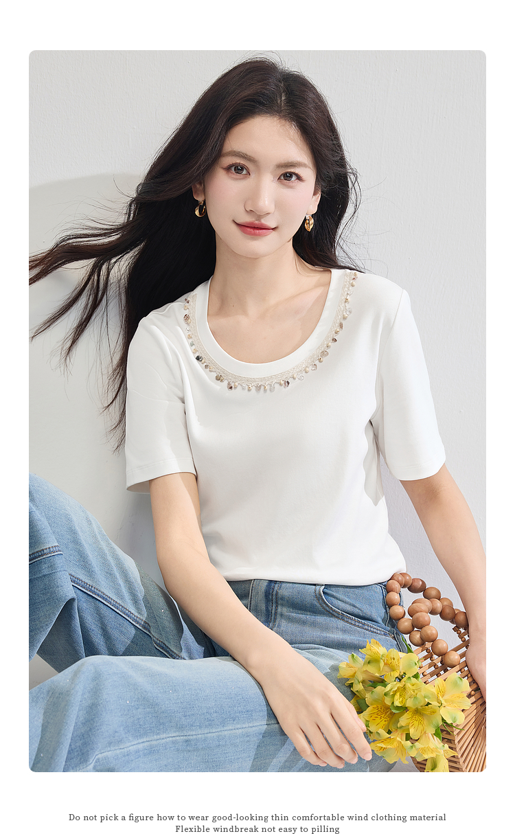 【五折购】熙世界彩珠圆领短袖T恤女设计感休闲百搭体恤棉上衣2025夏天新款