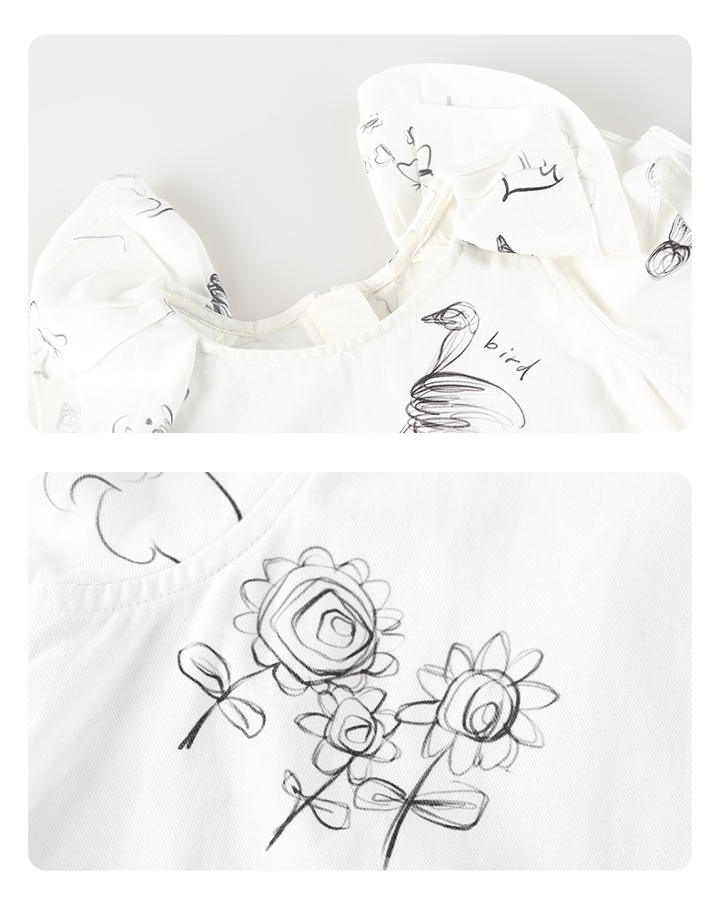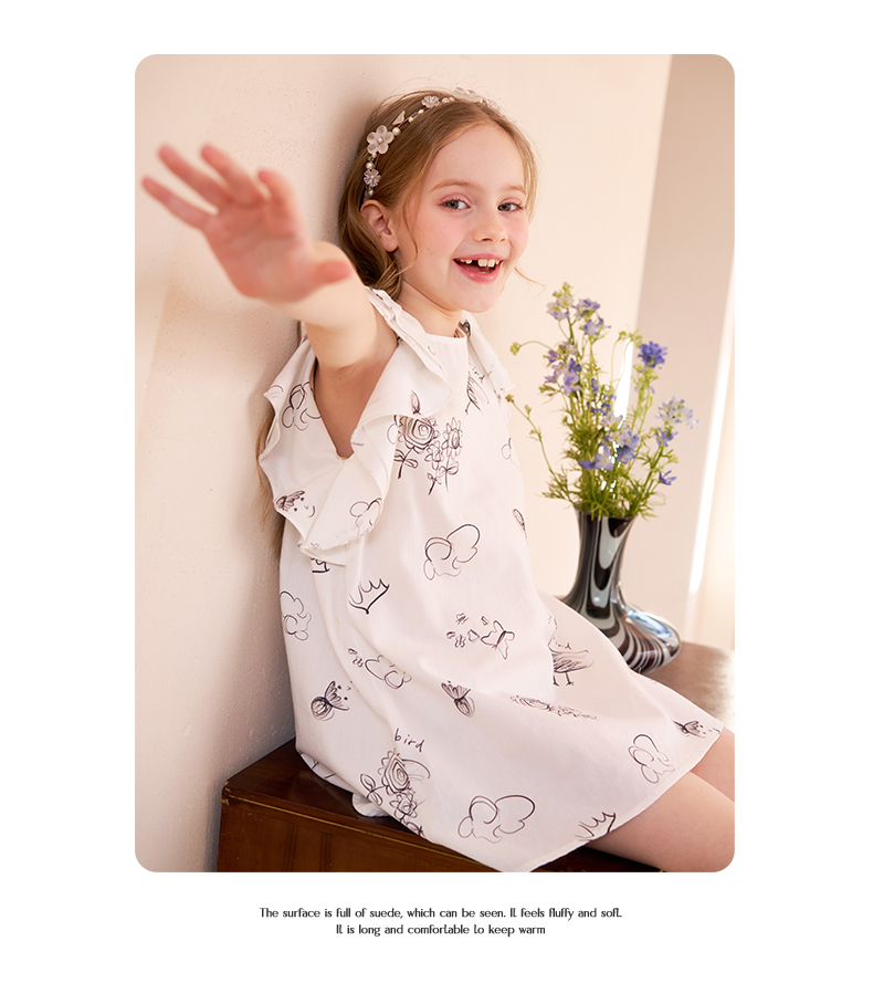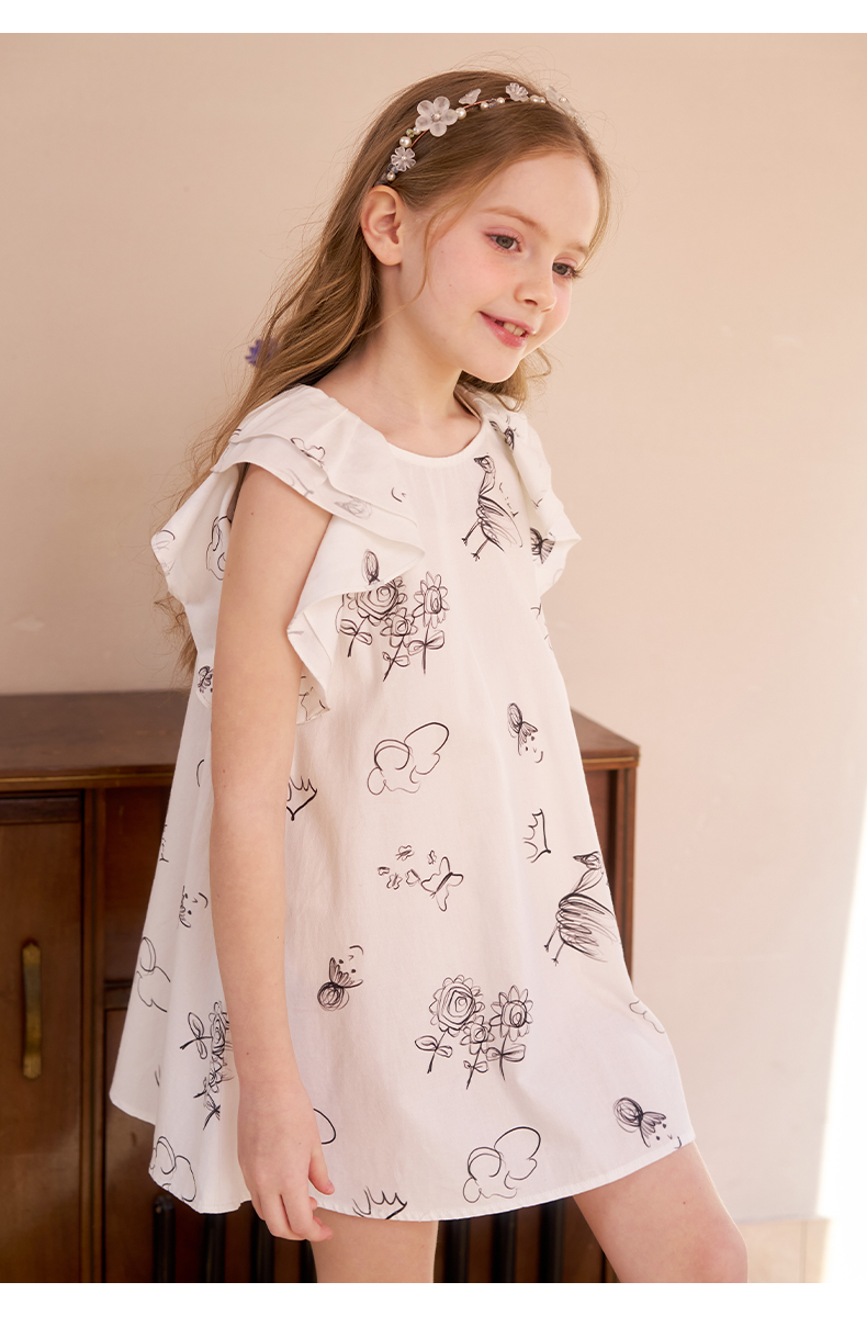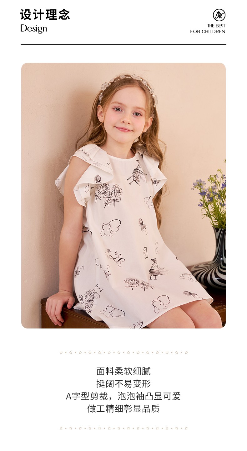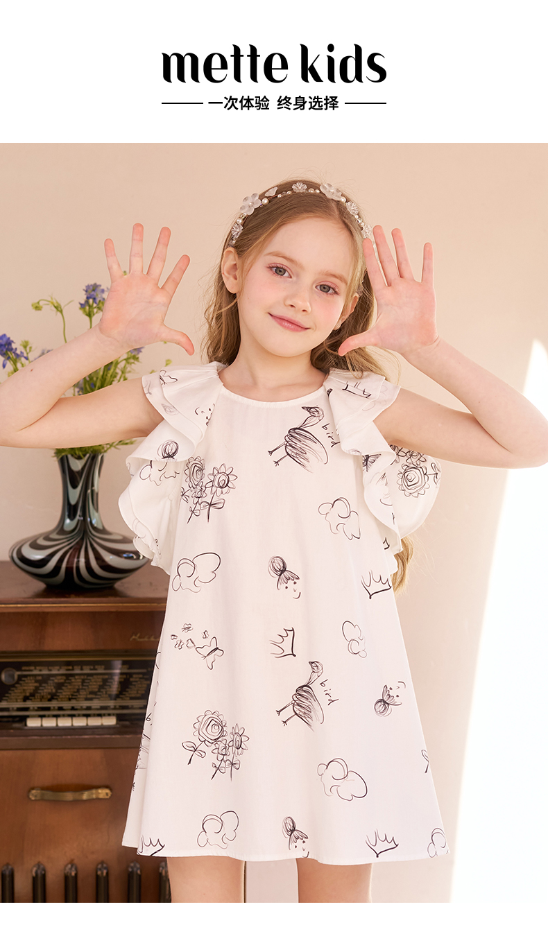 mettekids女童连衣裙夏季女孩白色印花公主裙儿童洋气纯棉裙子