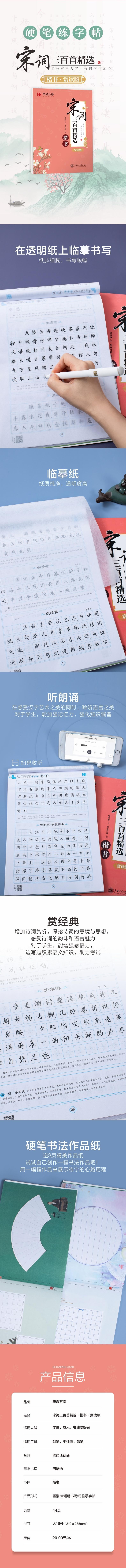 楷书作为最基础的书体,在日常生活中应用广泛,宋词是中华民族传统文化中的一颗熠熠生辉的明珠。本书将楷书练习与传统文化相结合,精选了广为流传的宋词优秀篇目,并对每首宋词都匹配了音频诵读赏析内容,增添了听读和鉴赏的功能,让练字者能在练习书写的同时品读优秀的文化精粹。开本采用大16开,容量更大,内容更加丰富。形式采用竖翻蒙纸,练字者可用钢笔或中性笔在临摹纸上摹写。适用于需要学习古诗文的学生群体及喜爱传统文化的练字人群。