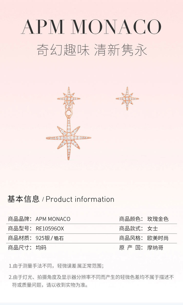 【授权商品】APM MONACO 女士玫瑰金色925银锆石耳环 RE10596OX