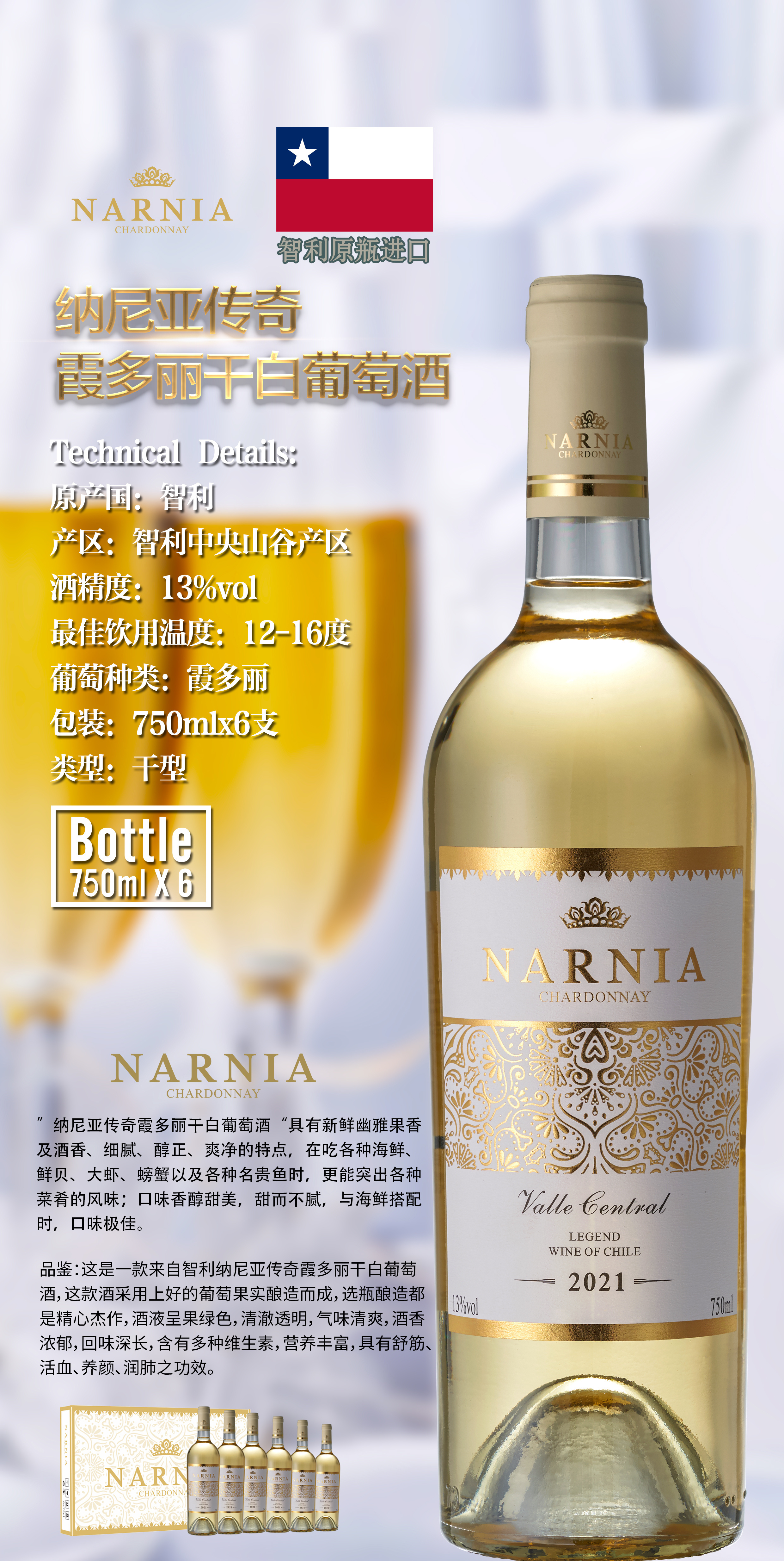 纳尼亚传奇霞多丽干白葡萄酒 750ml 13%vol 智利原瓶进口
