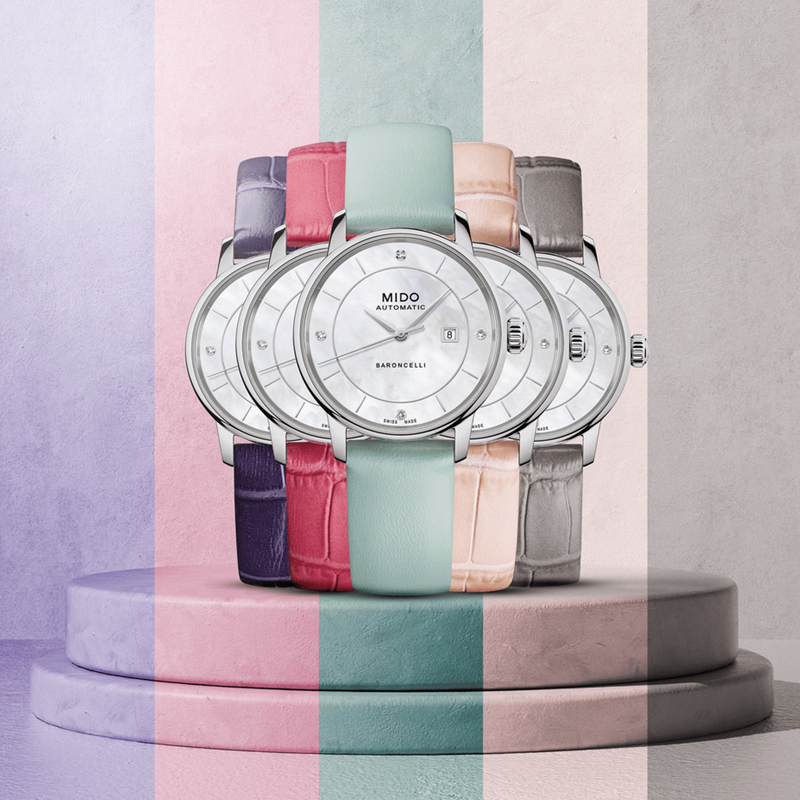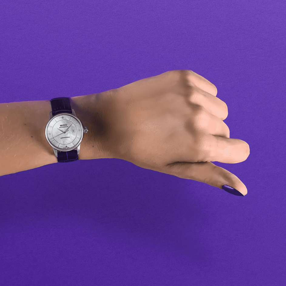 镜面 材质 | 蓝宝石水晶玻璃 | 表盘 | 丝光打磨不锈钢表壳 白色珍珠贝母表盘,边缘经精细抛光处理,4颗真钻作为刻度装饰,日期窗位于3点钟位置。刀型时针和分针,水平钻石切割秒针。 背透,可观测其精雕细刻的机芯,镌刻序列号 |
