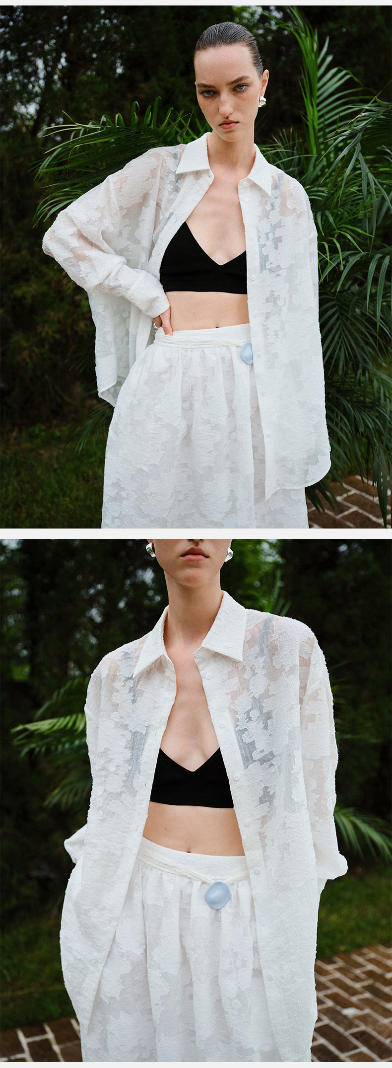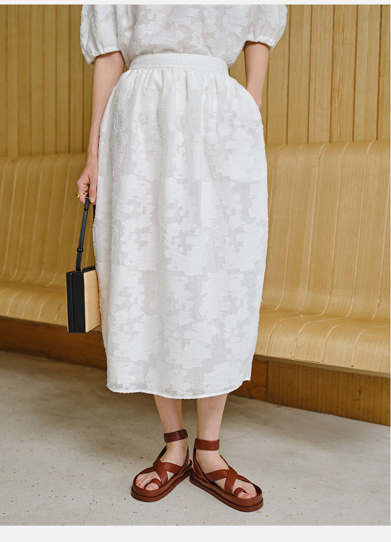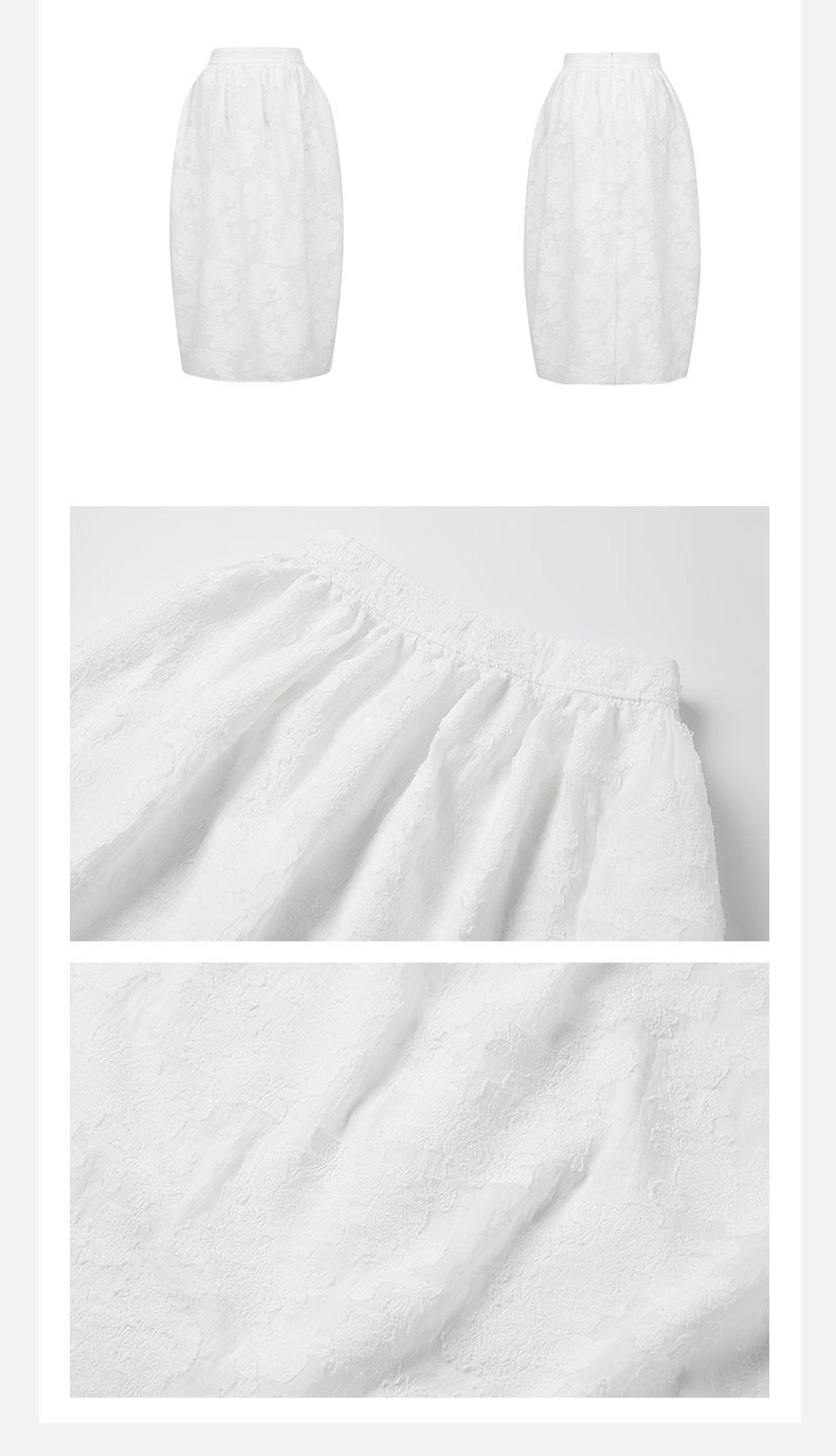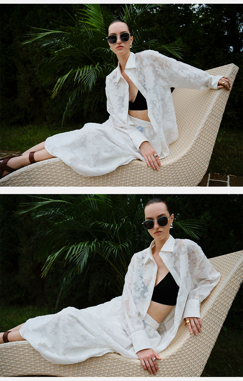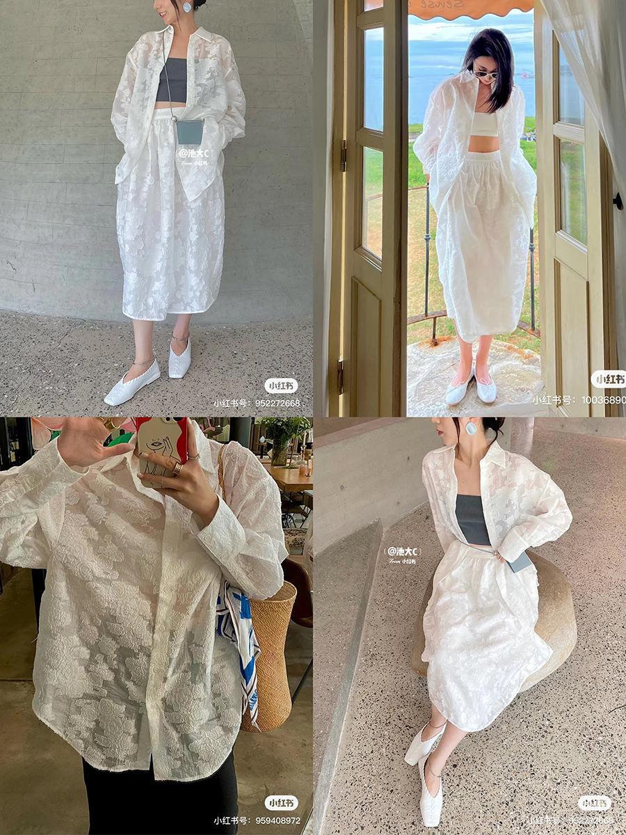 HIDEMI 度假系列浮雕剪花三件套 茧型半身裙/短袖上衣/长袖衬衫