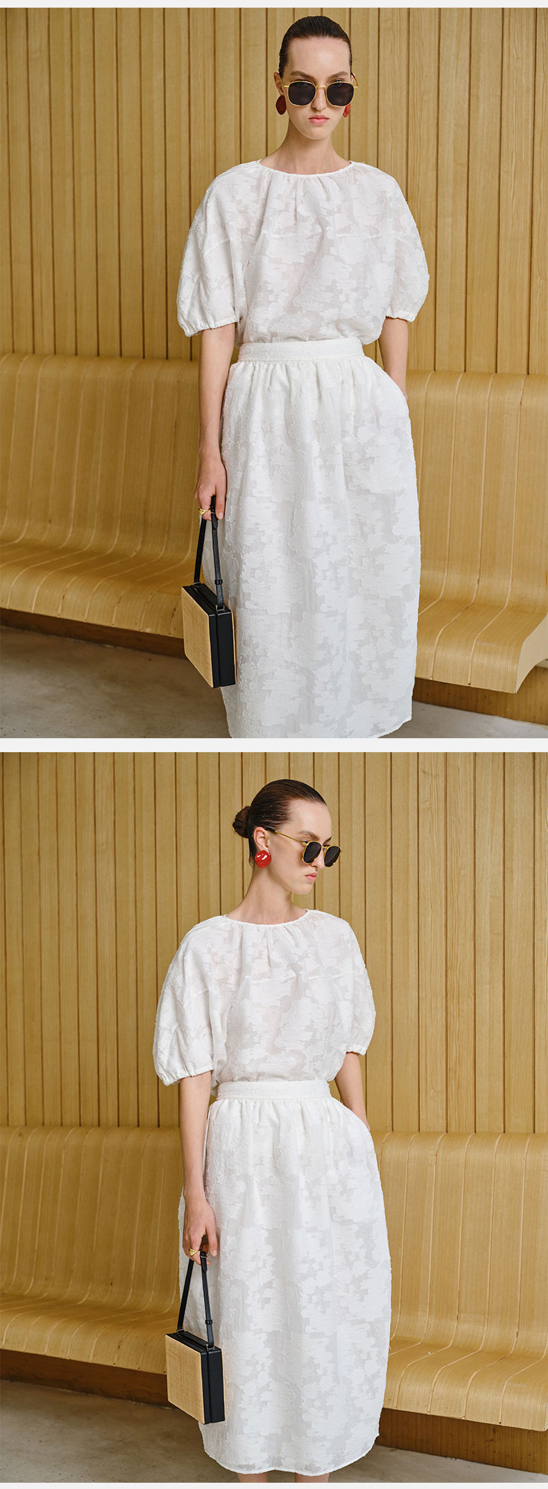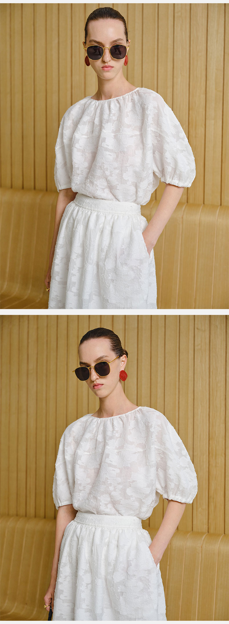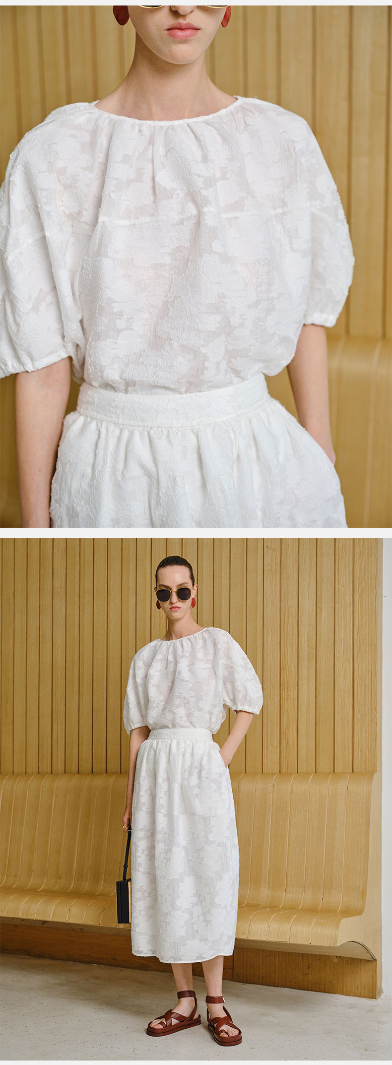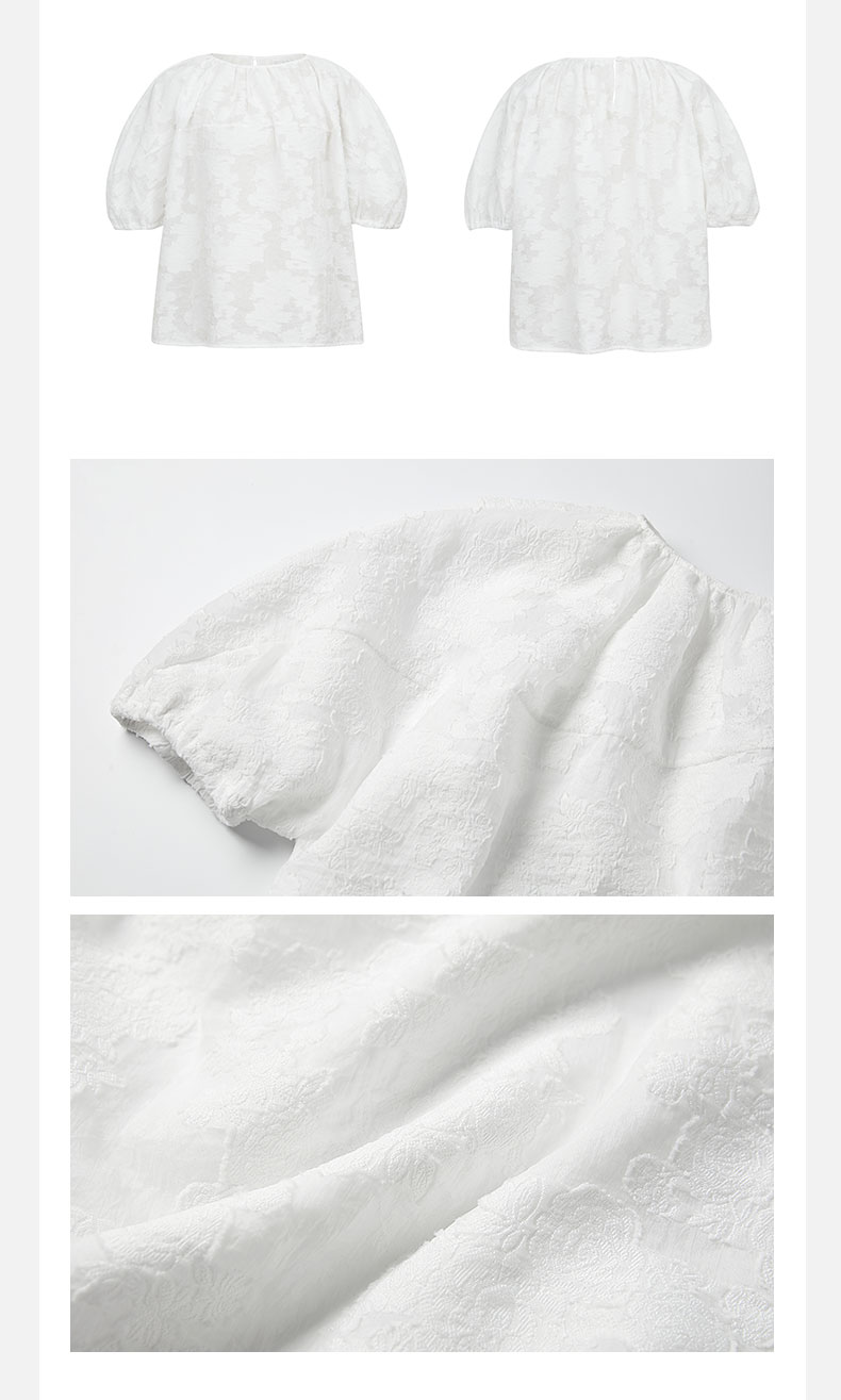HIDEMI 度假系列浮雕剪花三件套 茧型半身裙/短袖上衣/长袖衬衫