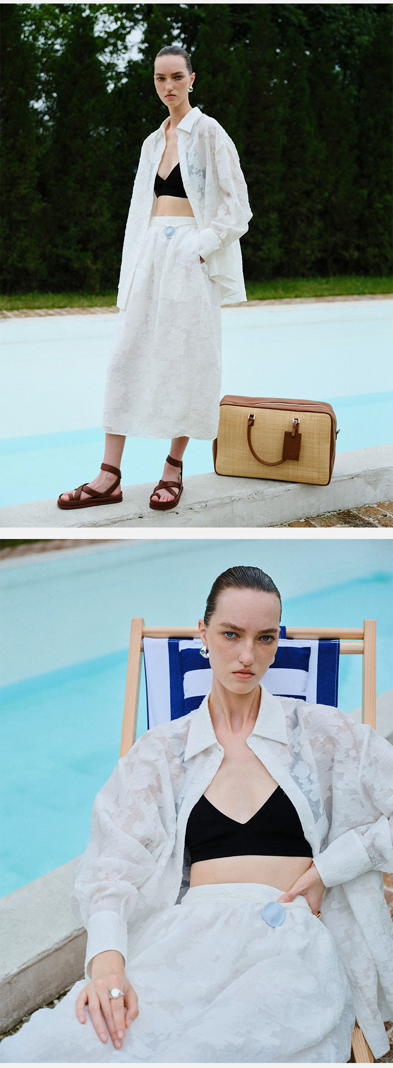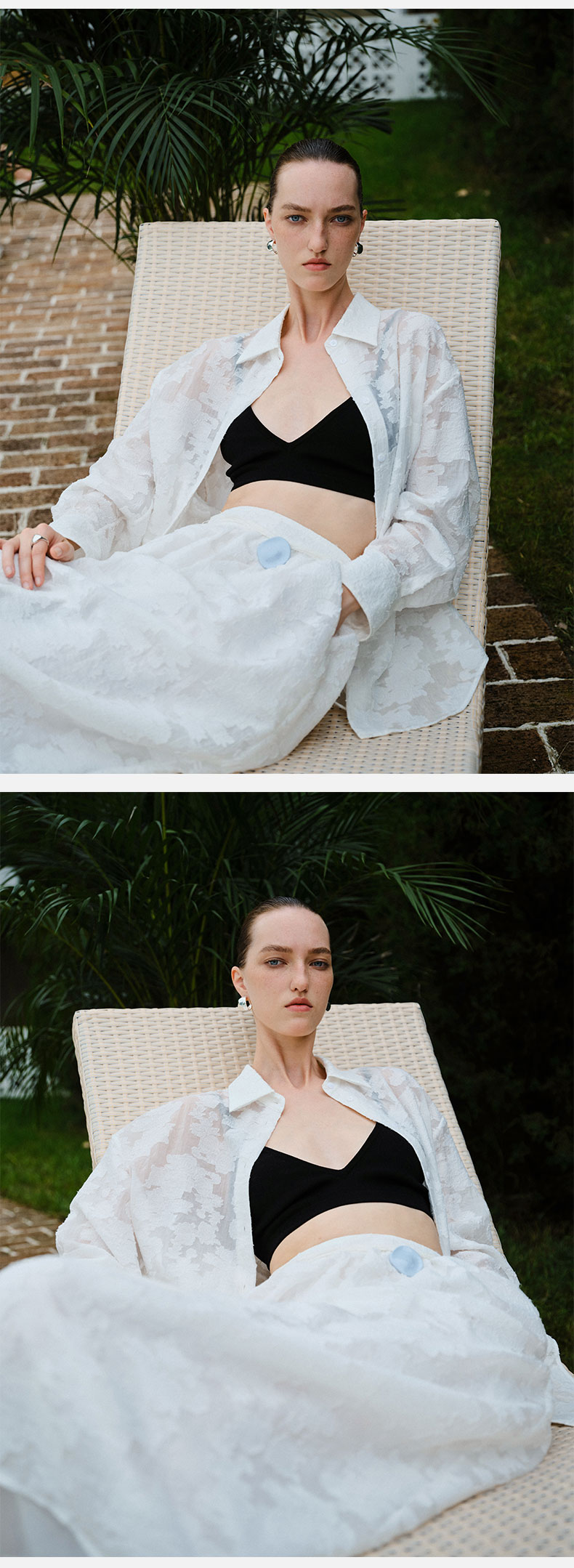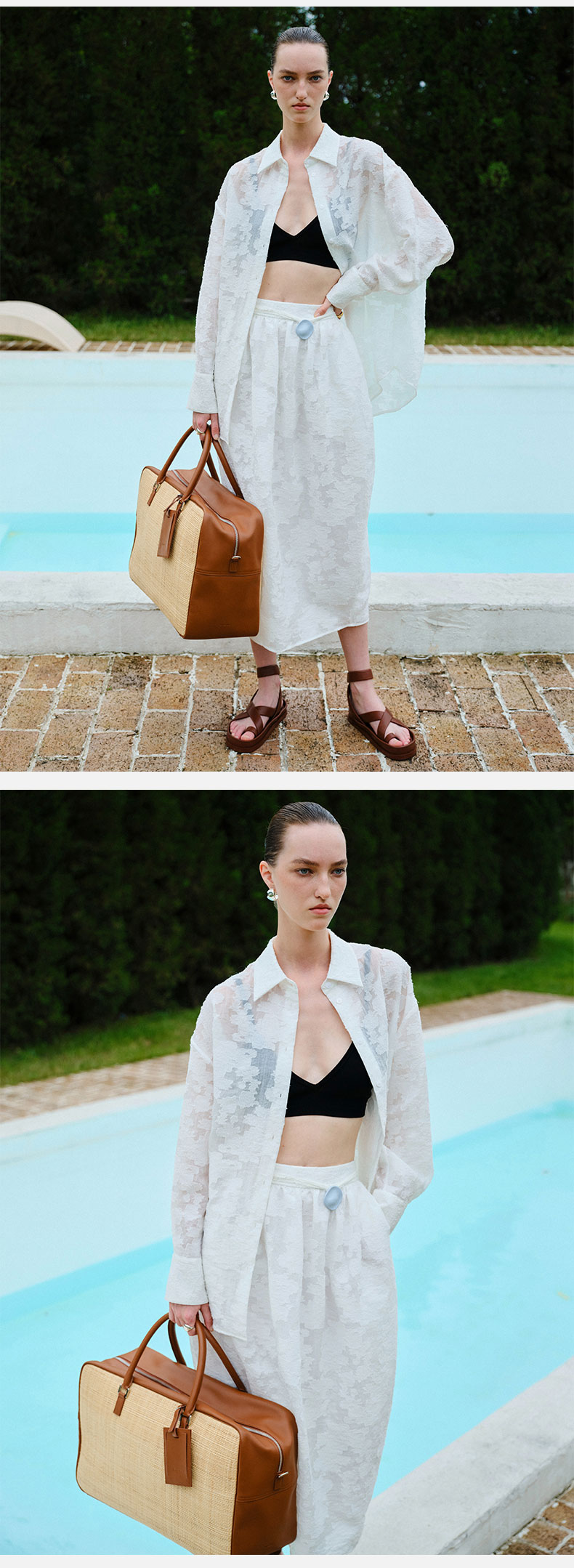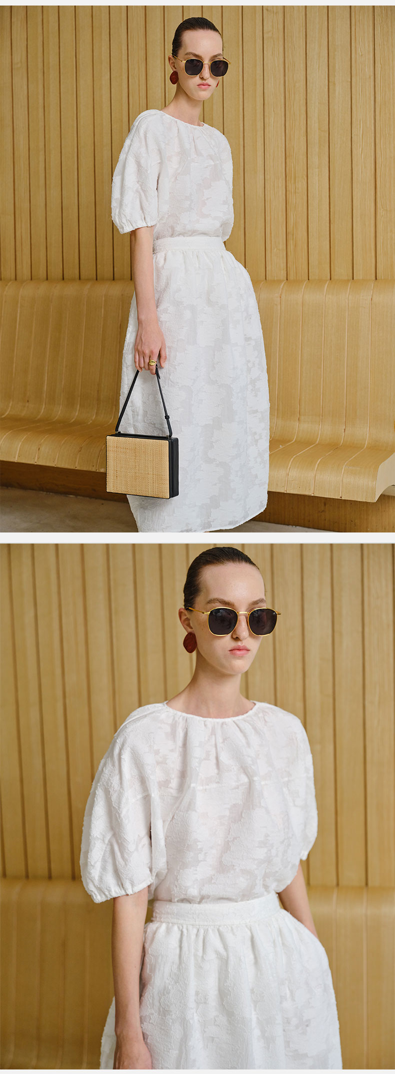 HIDEMI 度假系列浮雕剪花三件套 茧型半身裙/短袖上衣/长袖衬衫