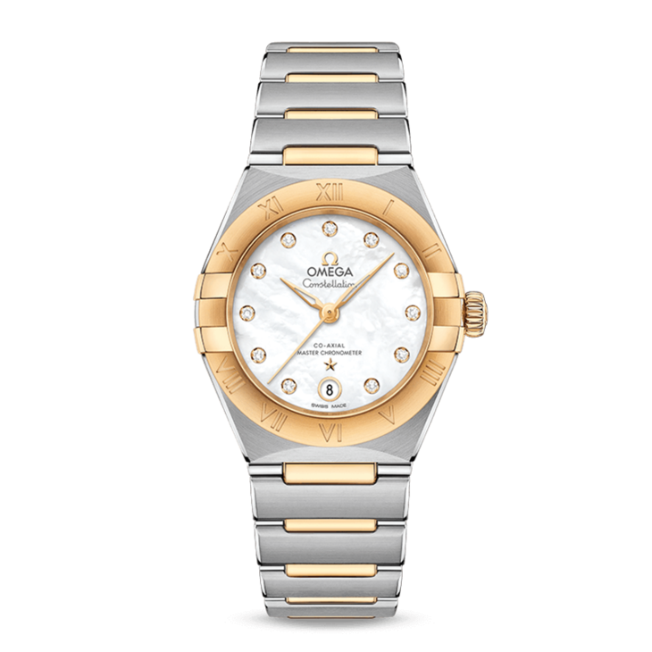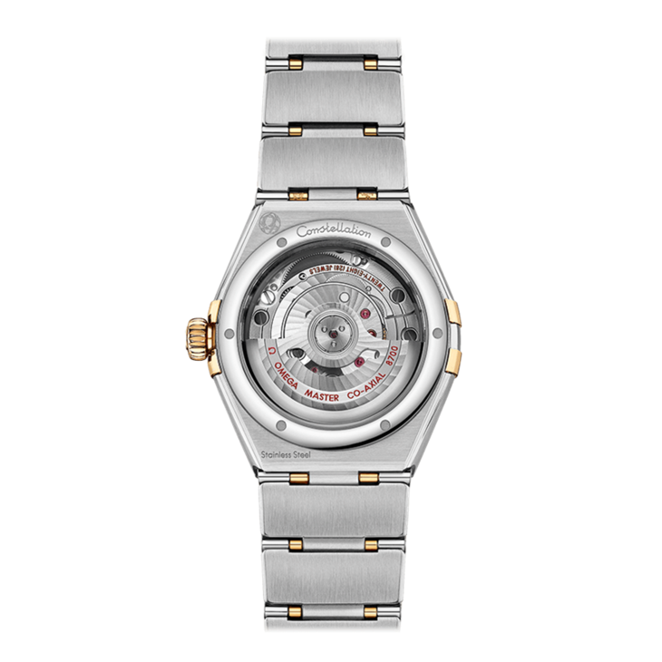 镜面材质 | 蓝宝石水晶玻璃 | 表盘 | 表壳上经典的半月形切面、“托爪”以及mono-rang表链。 由黄色18K金与精钢打造,表圈镌刻罗马数字刻度,珍珠母贝表盘饰有钻石小时刻度,6点钟位置设有日历窗口。指针、欧米茄品牌标识、星座徽标以及钻石托槽亦以黄色18K金打造而成。 透底 |