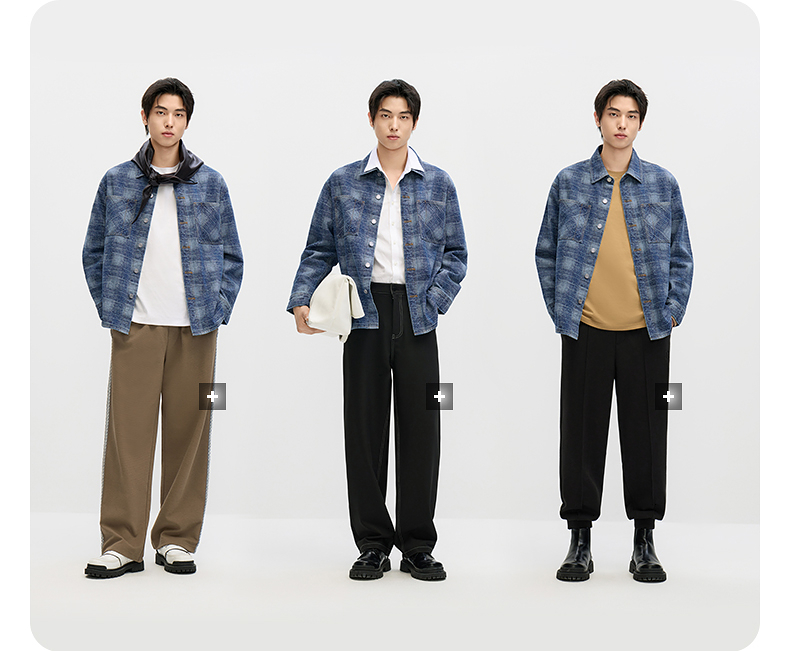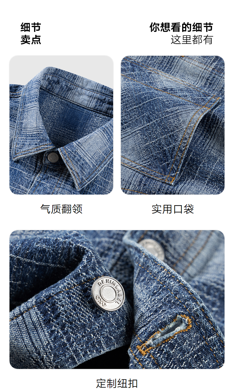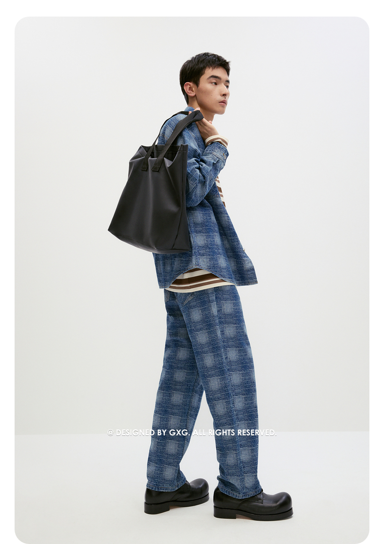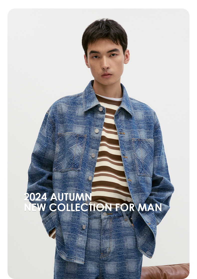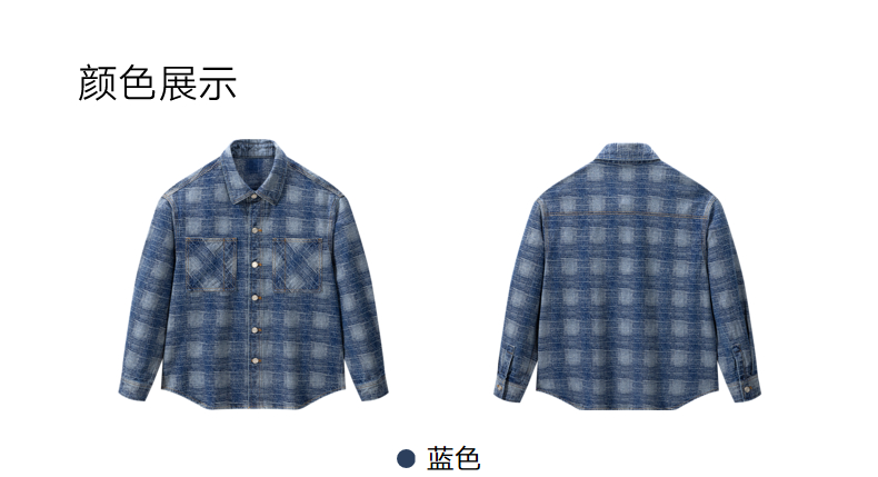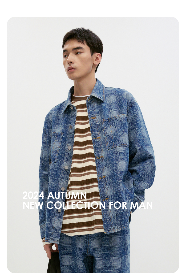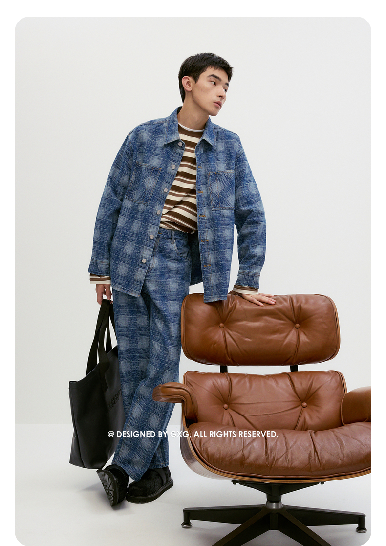 GXG男装 蓝色提花翻领牛仔长袖衬衫外套男士上衣 24年秋季热卖