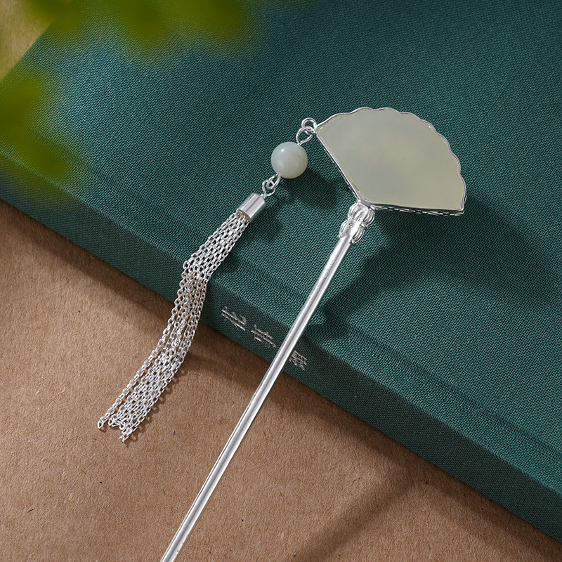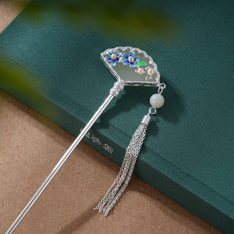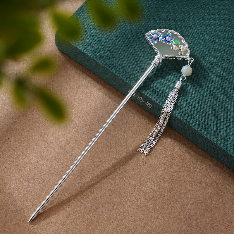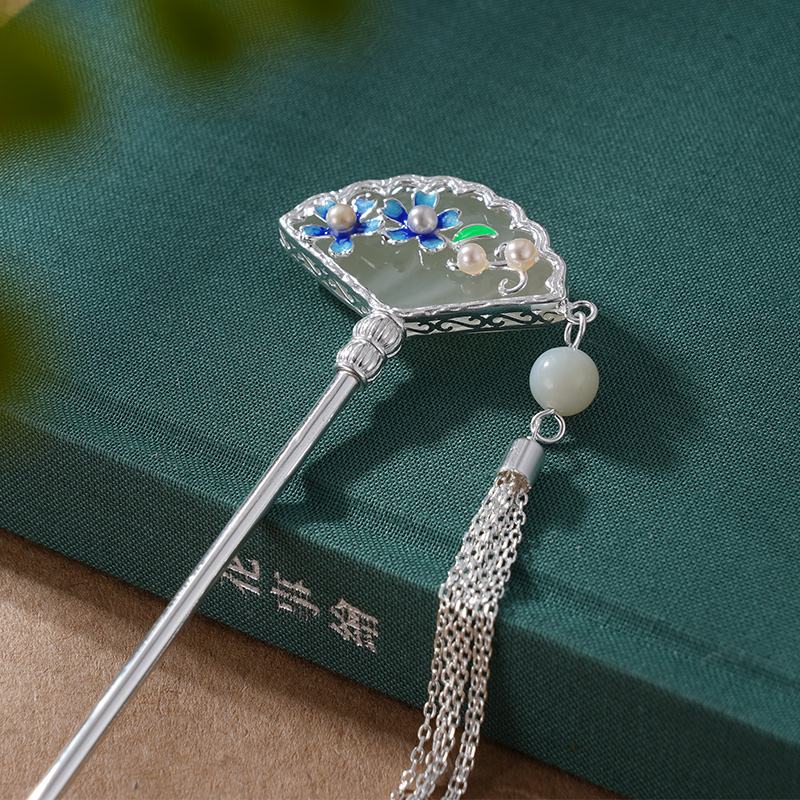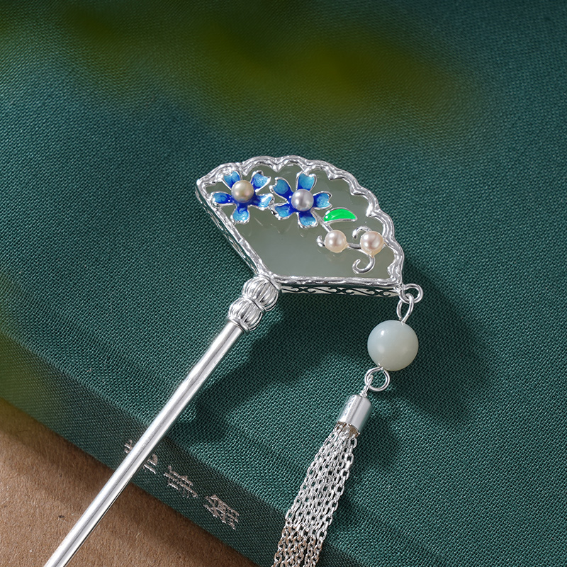 【寓意】:银花丝勾勒出扇形轮廓,内嵌和田玉,外饰流苏。风雅清韵,灵动婉转。花朵元素点缀其间,寓意富贵荣华,幸福美好。