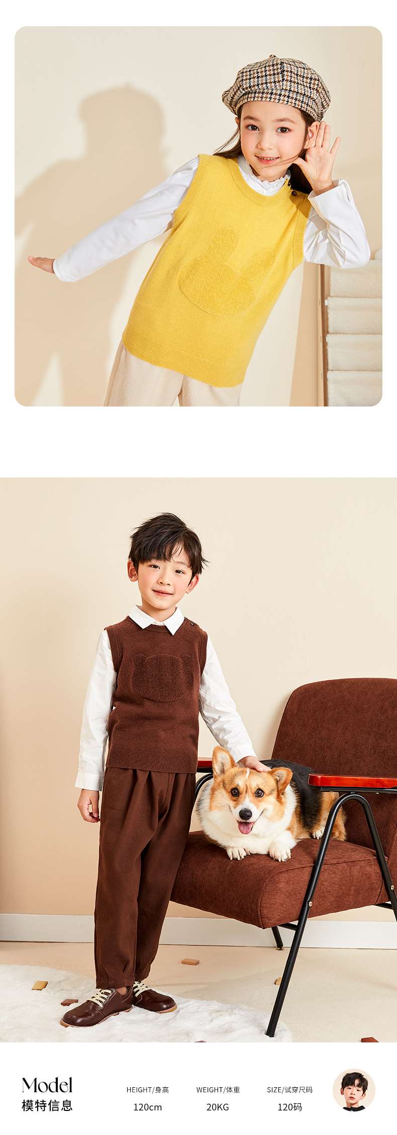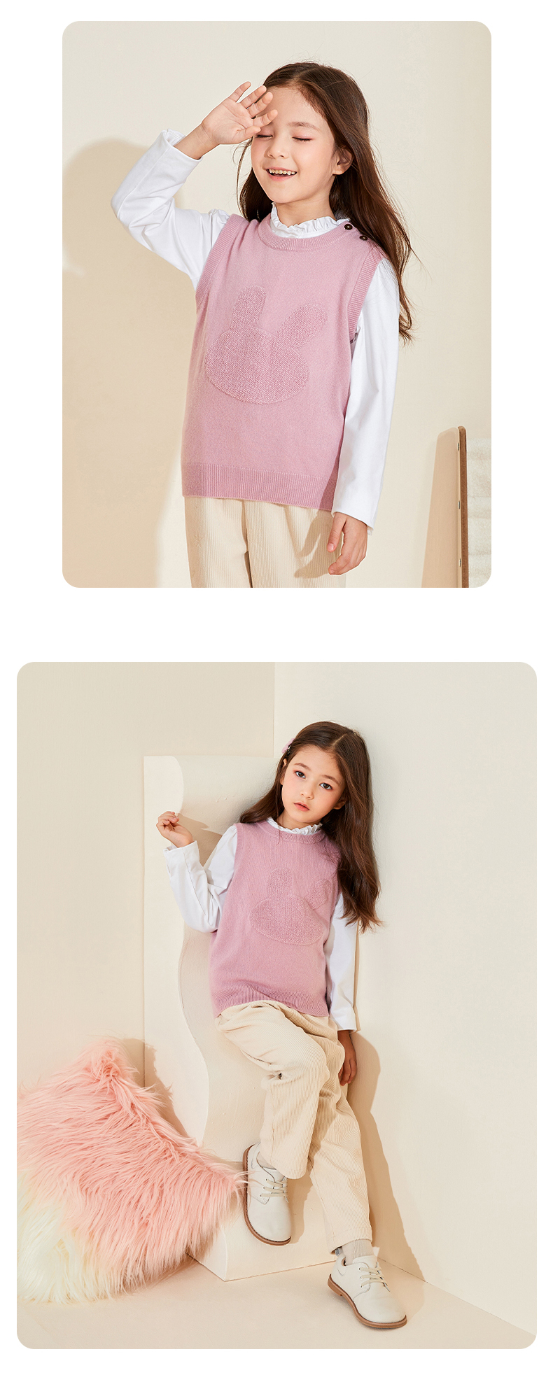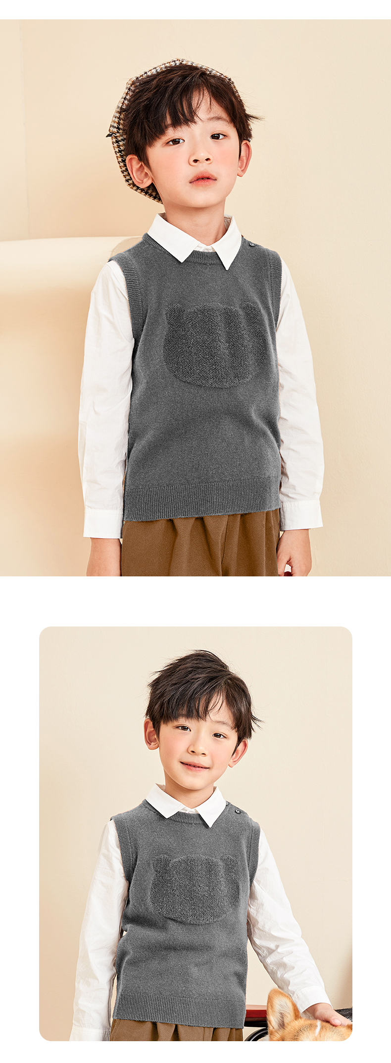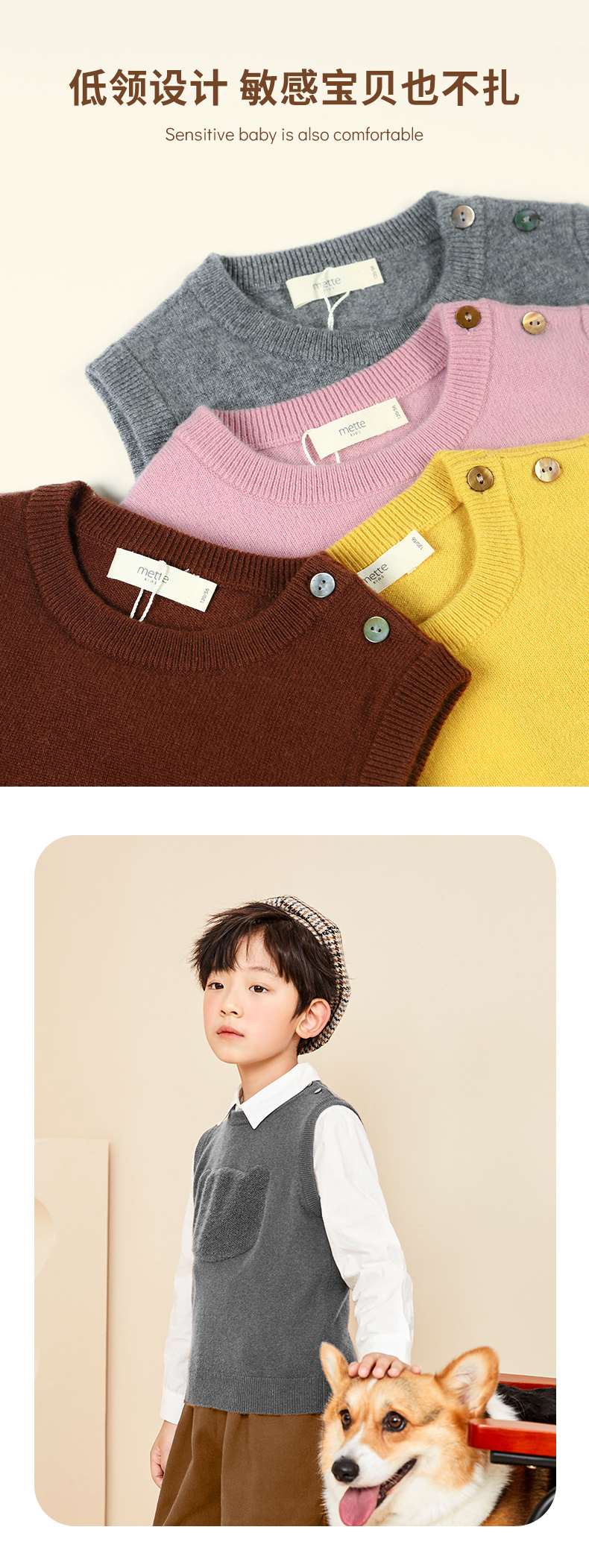 mettekids儿童纯羊绒衫2022春秋新款童装卡通套头毛衣背心针织衫