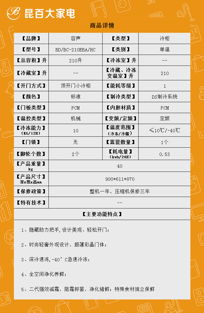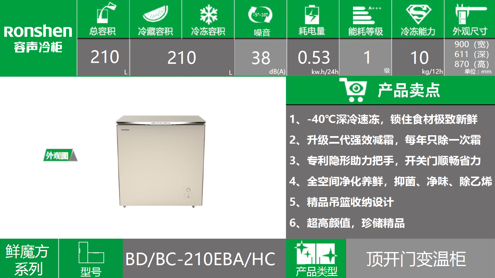 容声 冰柜 BD/BC-210EBA/HC 210升 单温 机械 玻璃门面板 超薄门体 雪肤内胆