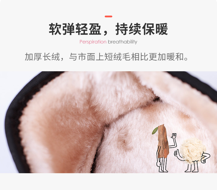 优质长绒毛(市面多为短绒毛)在鞋内形成恒温保暖层,并增加EVA材质鞋垫进行双层保暖防寒。