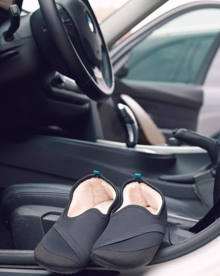 在车上备上一双,作为开车鞋。开车之前脱掉高跟鞋皮鞋换上,出行保暖又安全。