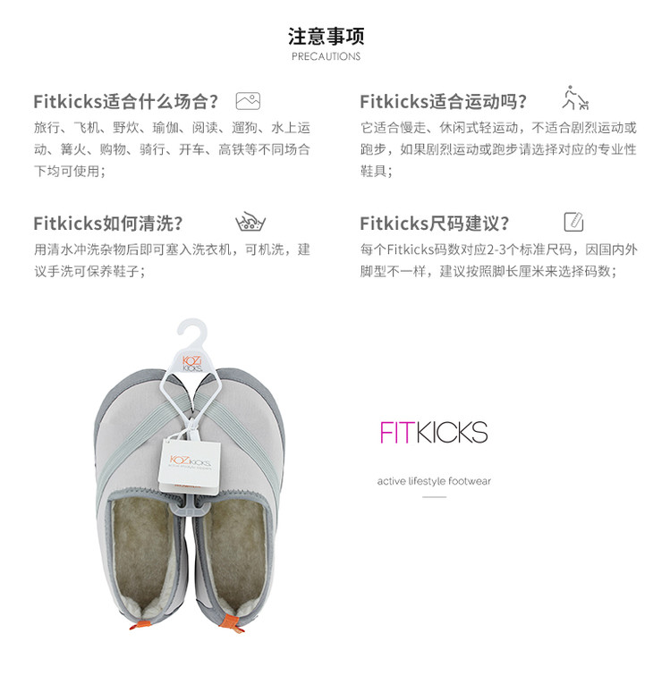 Fitkicks暖暖鞋保暖性极佳,出门逛街逛超市,散步,聚会,都可以穿上它。保暖又轻盈,堪称出门保暖神器,懒人一脚蹬就可以舒服出门