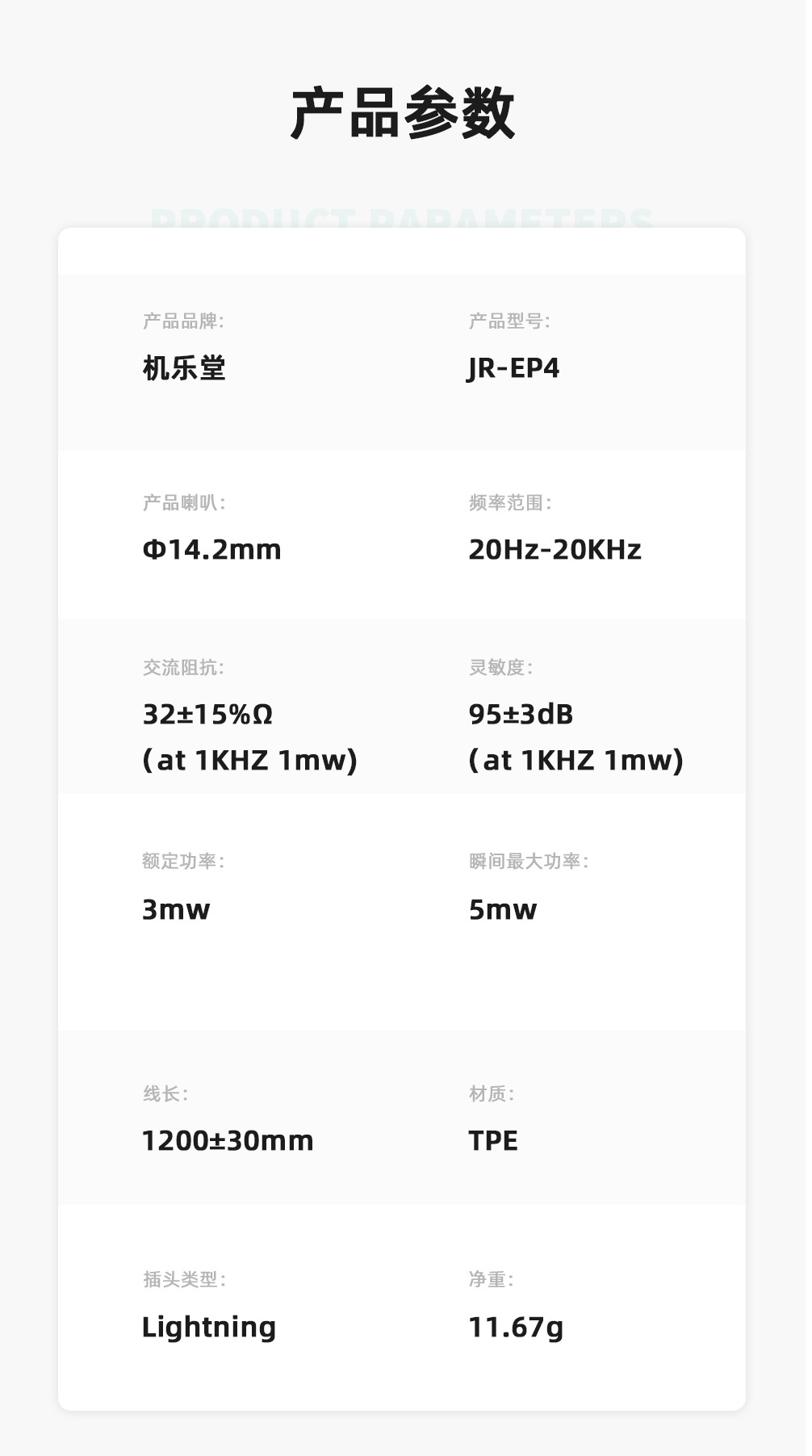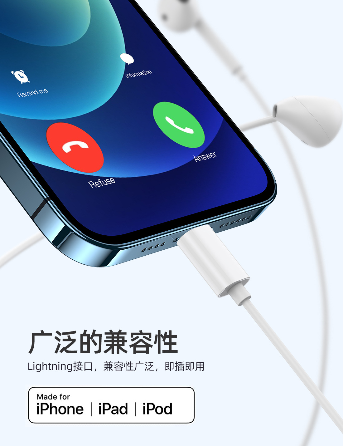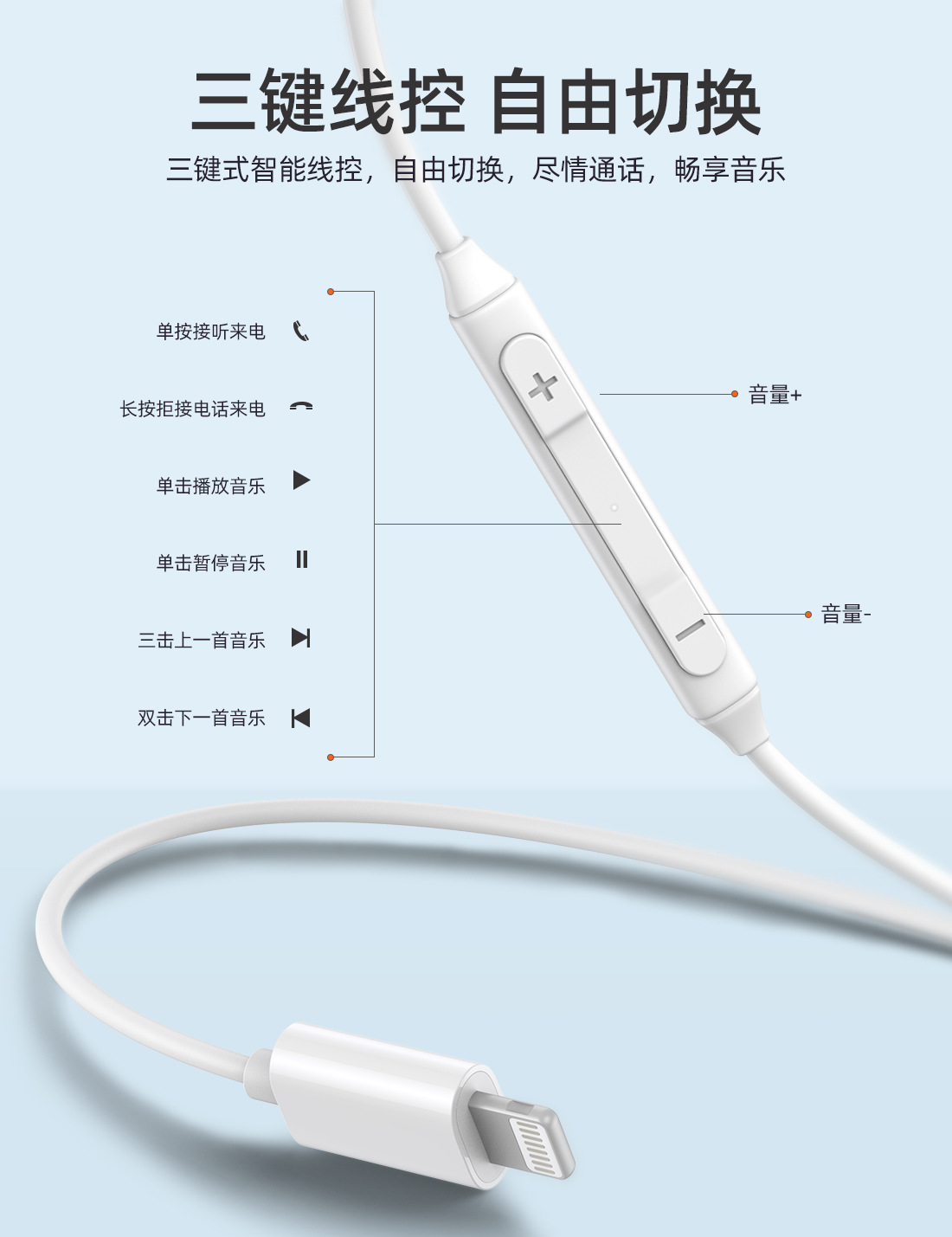 机乐堂lightning线控耳机JR-EP4白色白色动圈式半入耳游戏通话无延迟适用于苹果