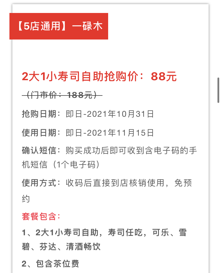 抢购截止日期10月31日【5店通用|一碌木寿司】实现寿司自由!100+款日料不限量任吃!¥88抢门市价188元2大1小寿司自助!可乐、雪碧、清酒等畅饮