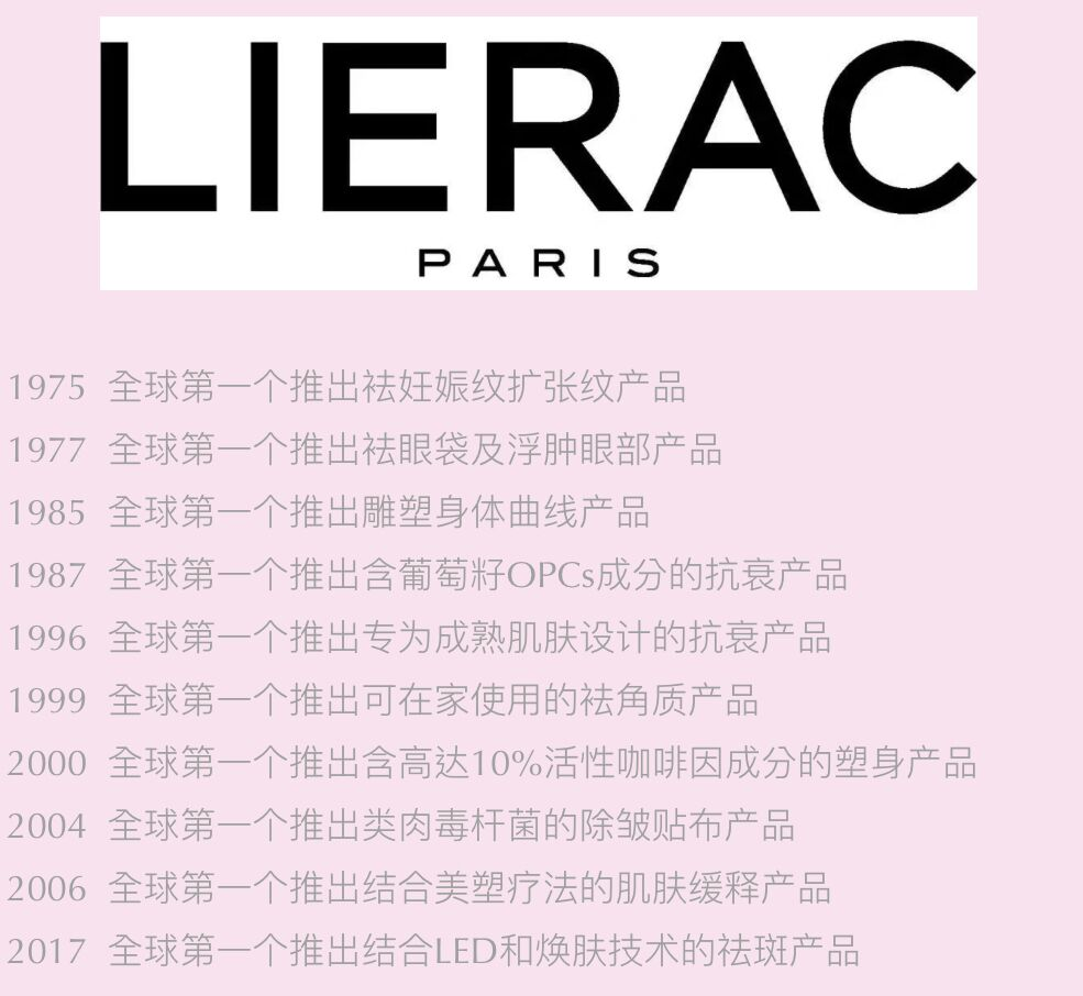 LIERAC本身就是法国尖端实验室医镁品牌,在法国与理肤泉、薇姿、欧缇丽齐,与菲洛嘉同系。产品是出了名的高效,蕞擅长去除皱纹、眼袋、妊娠纹等。很多世界第①的开创性产品就是来自Lierac!