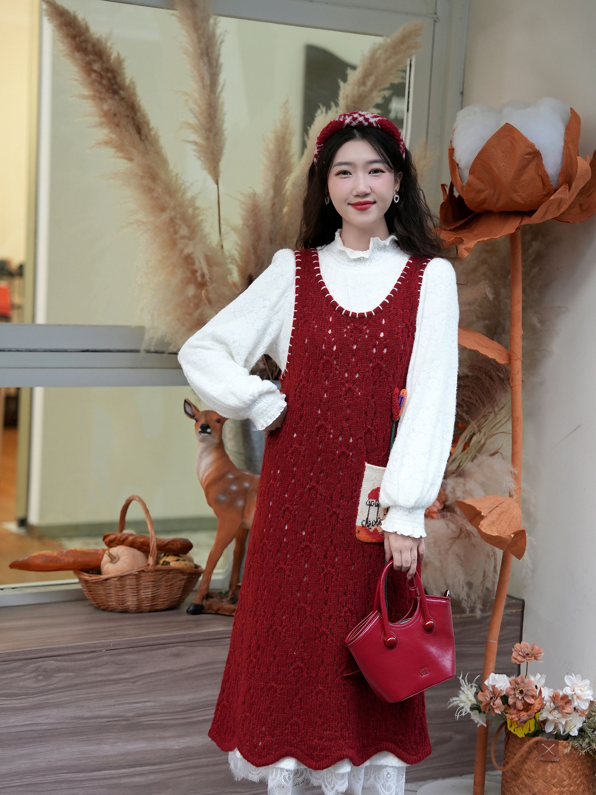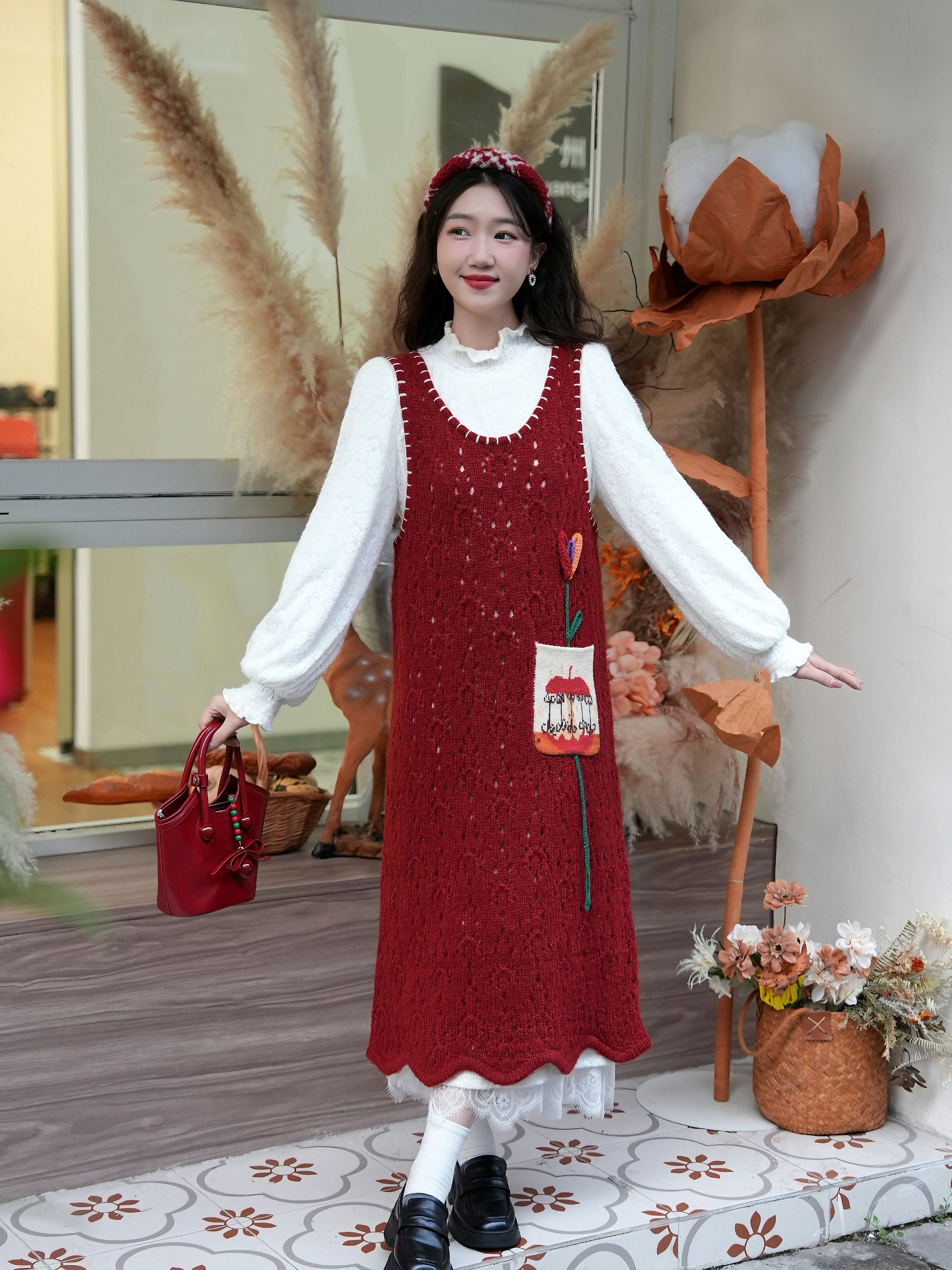 两三事 爱意生长2025冬新款森系风立体手钩花镂空针织背心连衣裙