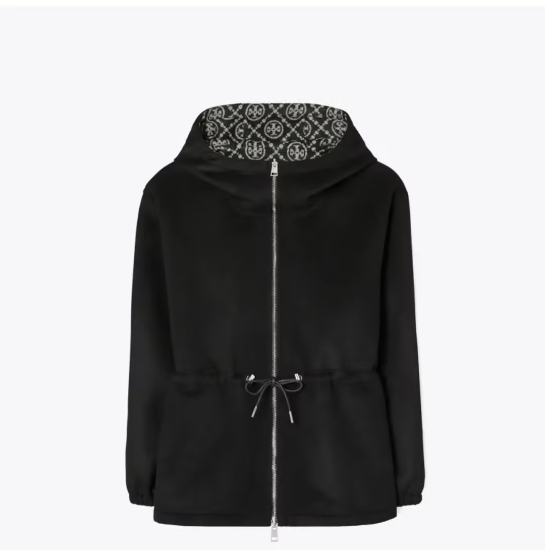 拉链扣;兜帽和腰部搭配拉绳;袖口采用弹性设计