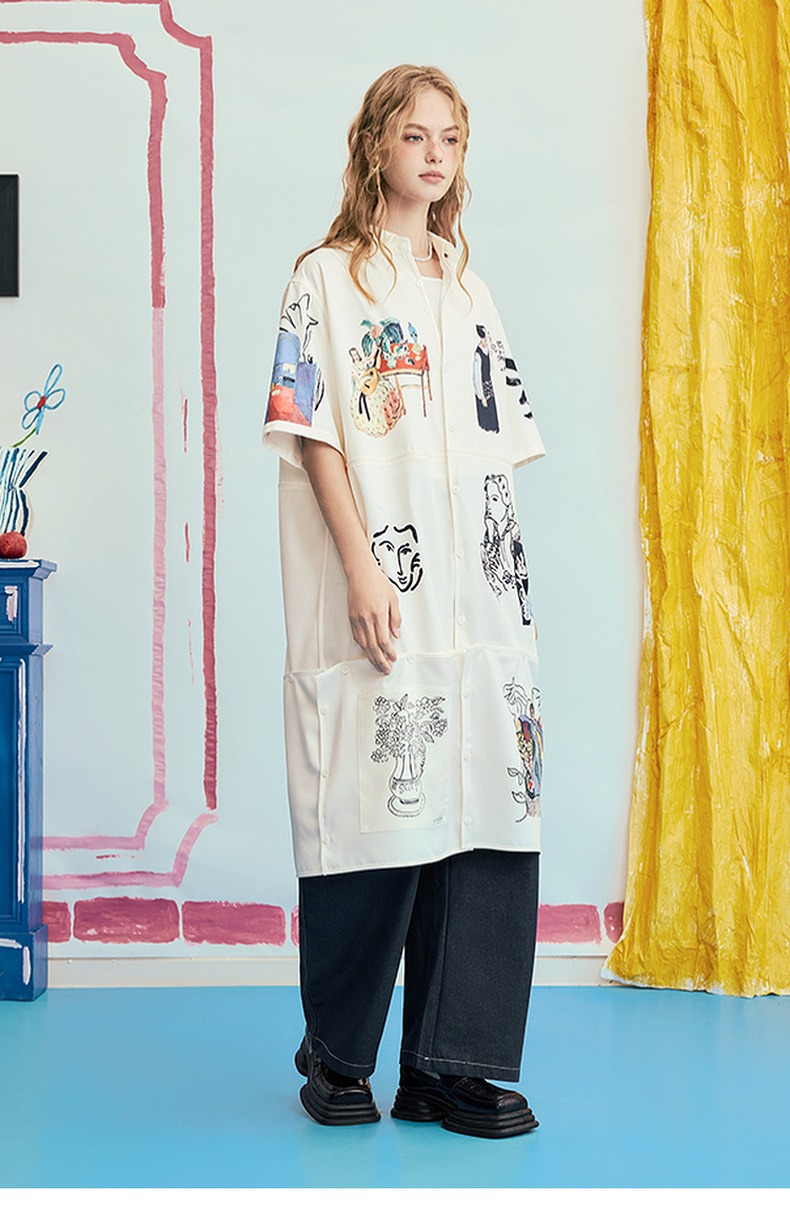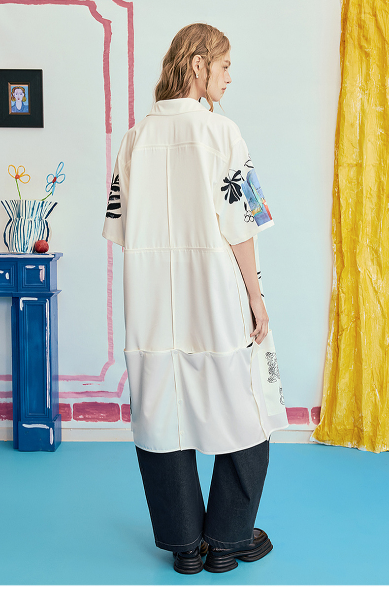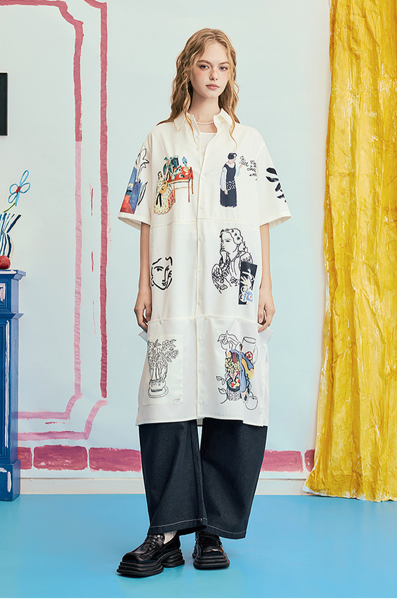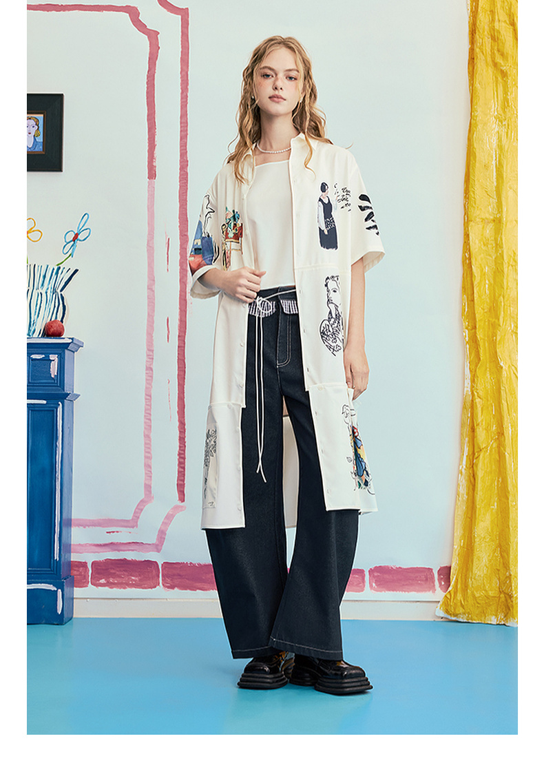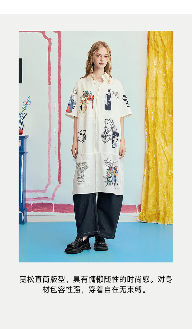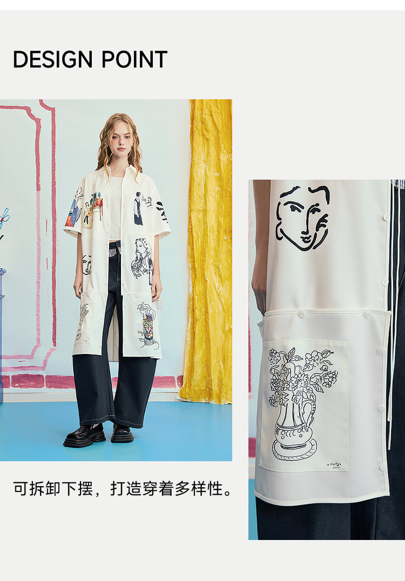 两三事 安妮心事 2025夏季新款时尚可拆下摆涂鸦印花衬衫女中长款