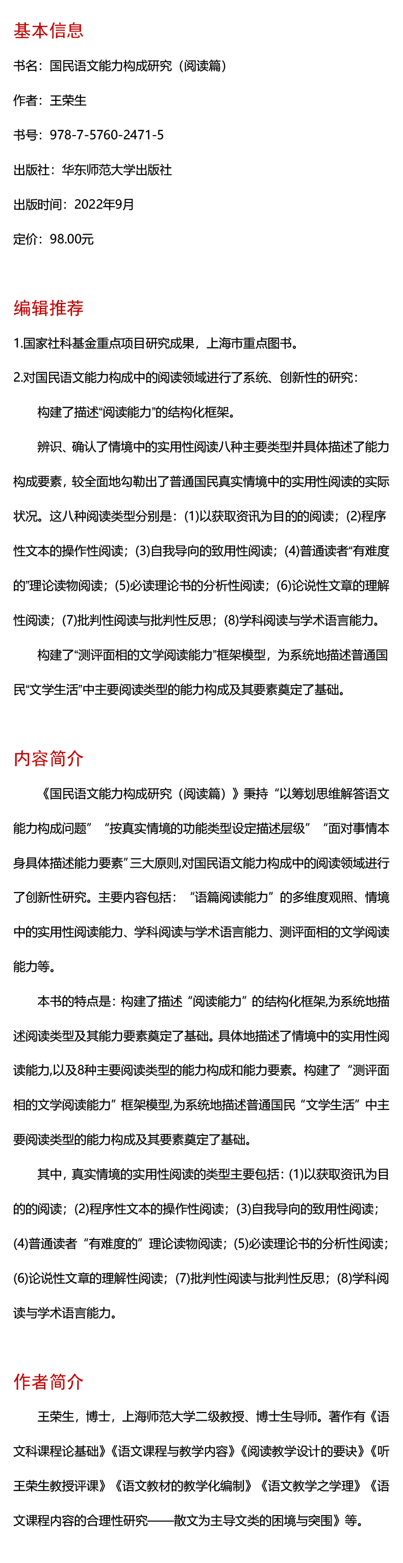 国民语文能力构成研究 阅读篇 王荣生著 语文阅读教学研究