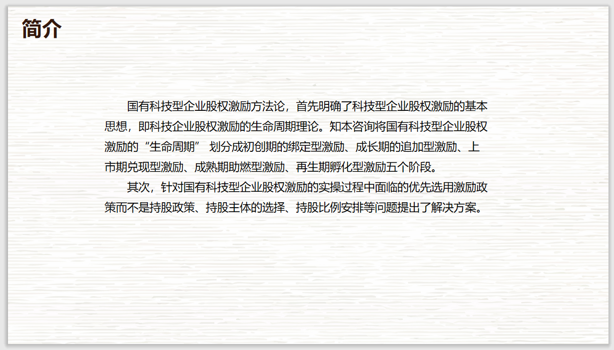 国企改革方法论 主要是在相关政策研究的基础上,结合典型案例,针对国有企业改革过程中存在的方方面的问题,提炼而出的具有实操性、系统性的解决方案。知本咨询国企改革方法论,聚焦于 混改和股权多元化、干部机制、三项制度、国企创新、两类公司、中长期激励、管控与治理优化、对标世界一流、国有企业产业整合和重组 等不同领域,为国有企业提供可快速落地的改革模型、改革路径、改革举措等,帮助国有企业早日实现改革目标。