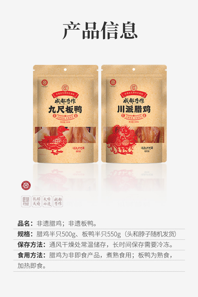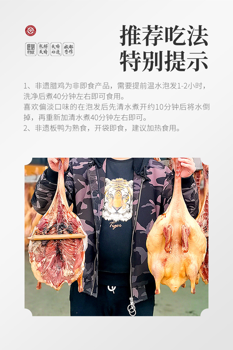 ②非遗板鸭为熟食,开袋即食,建议加热食用(冷藏保存后必须加热30秒以上食用);