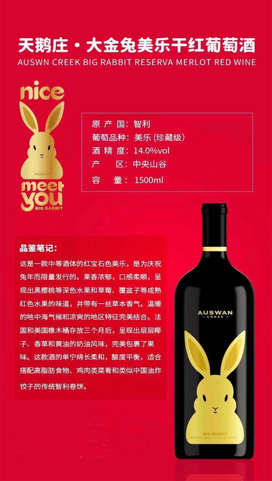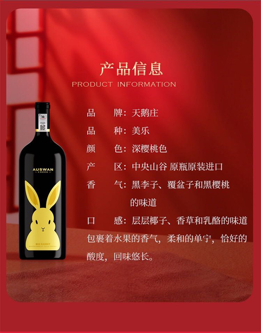 天鹅庄大金兔美乐干红葡萄酒(1箱4瓶)