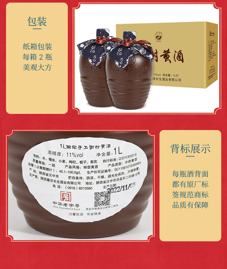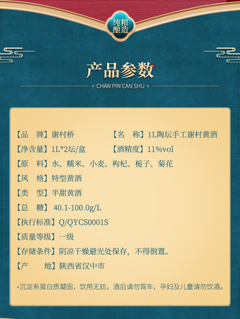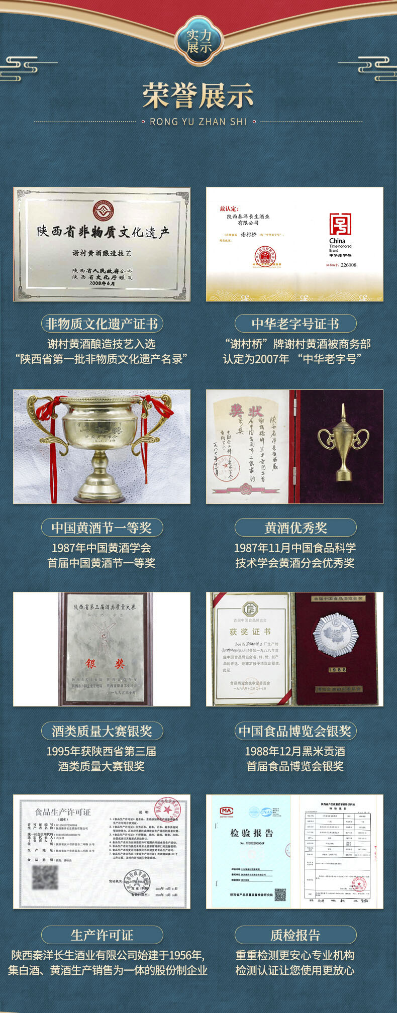 “谢村桥”牌谢村黄酒是陕西省名牌、中华老字号,其酿造技艺入选陕西省第一批非物质文化遗产重点保护名录。选用糯米、小麦、枸杞、栀子、菊花为原料,经制曲、浸米、蒸饭、糖化发酵、压榨、陈酿等工序酿制而成。