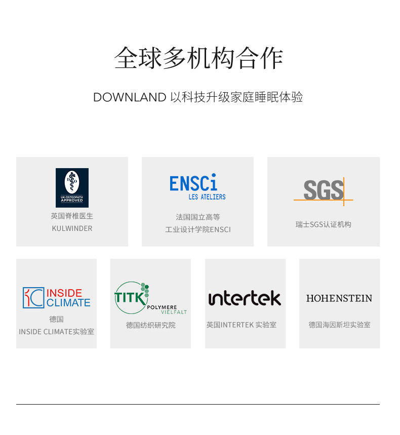 DOWANLAND China联合德国睡眠研究实验室(最好有具体的名字),以睡眠“温度”和“触感”为切入点,从人体生物学出发,去了解不同性别、年龄、体质人群的差异化睡眠需求,期望为“每个人”量身定制睡眠体验;与此同时,不断探索与应用创新技术和材料,从仿生、极限运动,甚至航天领域去获取创新灵感,以期解决家庭睡眠中一个个具体的问题。