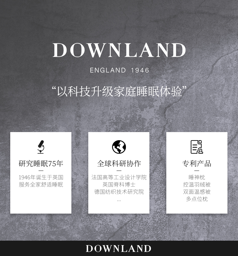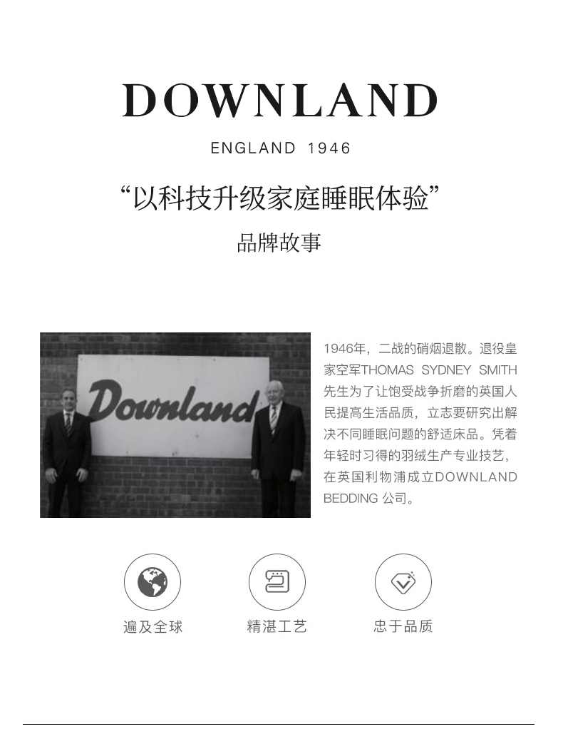 凭借年轻时掌握的羽绒制作手艺,他坚信,一场好的睡眠对「人的自我修复」有着至关重要的意义,通过优质的睡眠产品,DOWNLAND为更多饱受战后睡眠障碍困扰的同胞提供「良好睡眠」的解决方案。如今DOWANLAND已成为英国四大顶级床品之一。