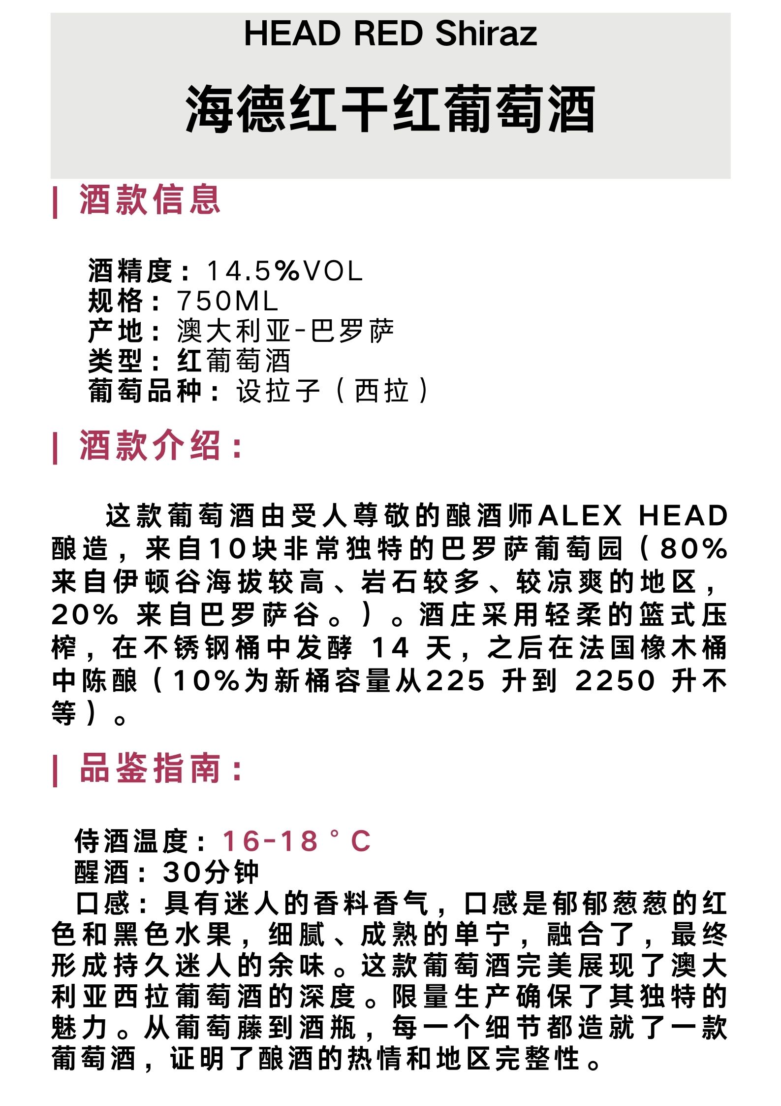 海德红干红葡萄酒2018HEAD RED Shiraz2018
