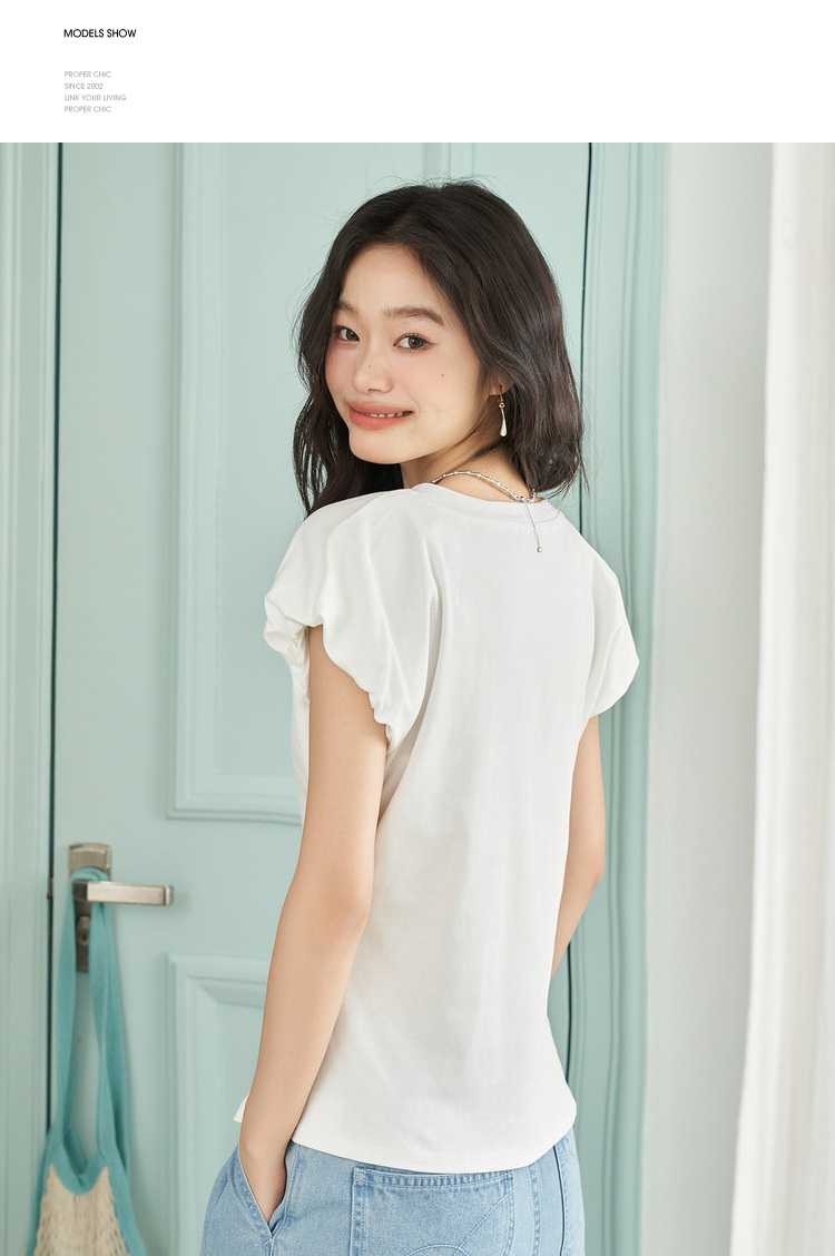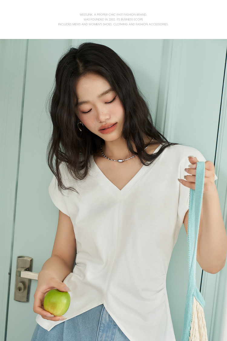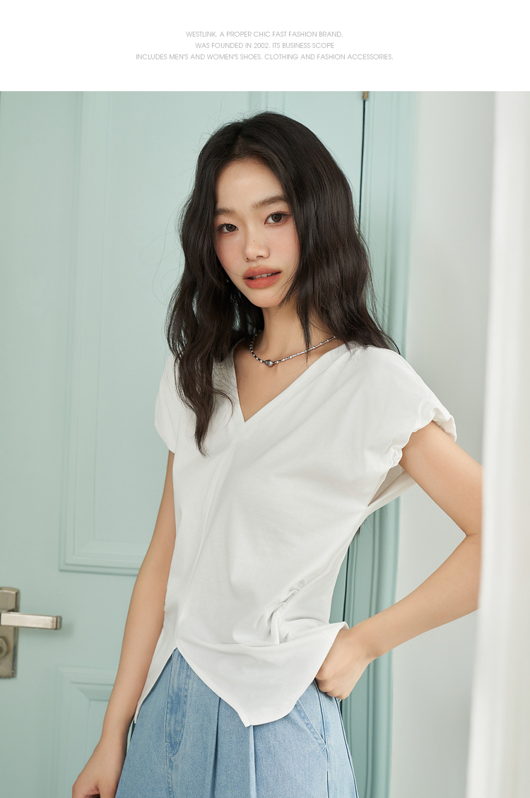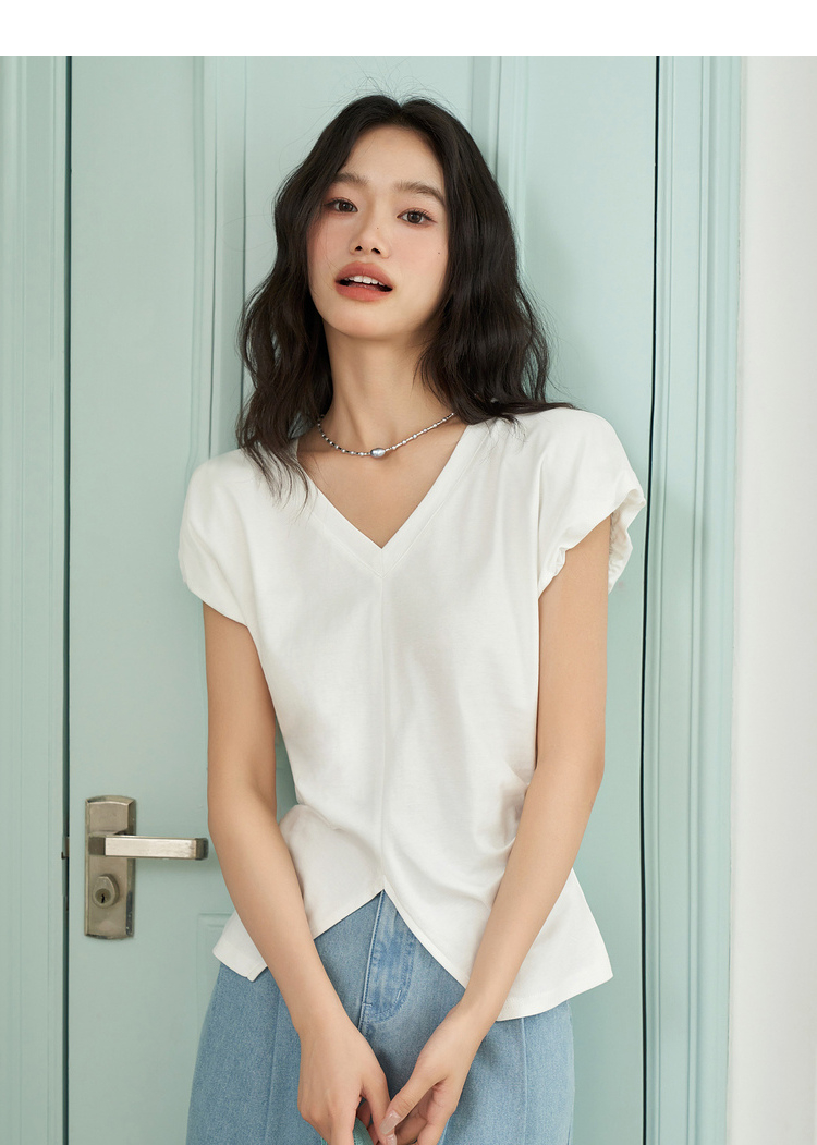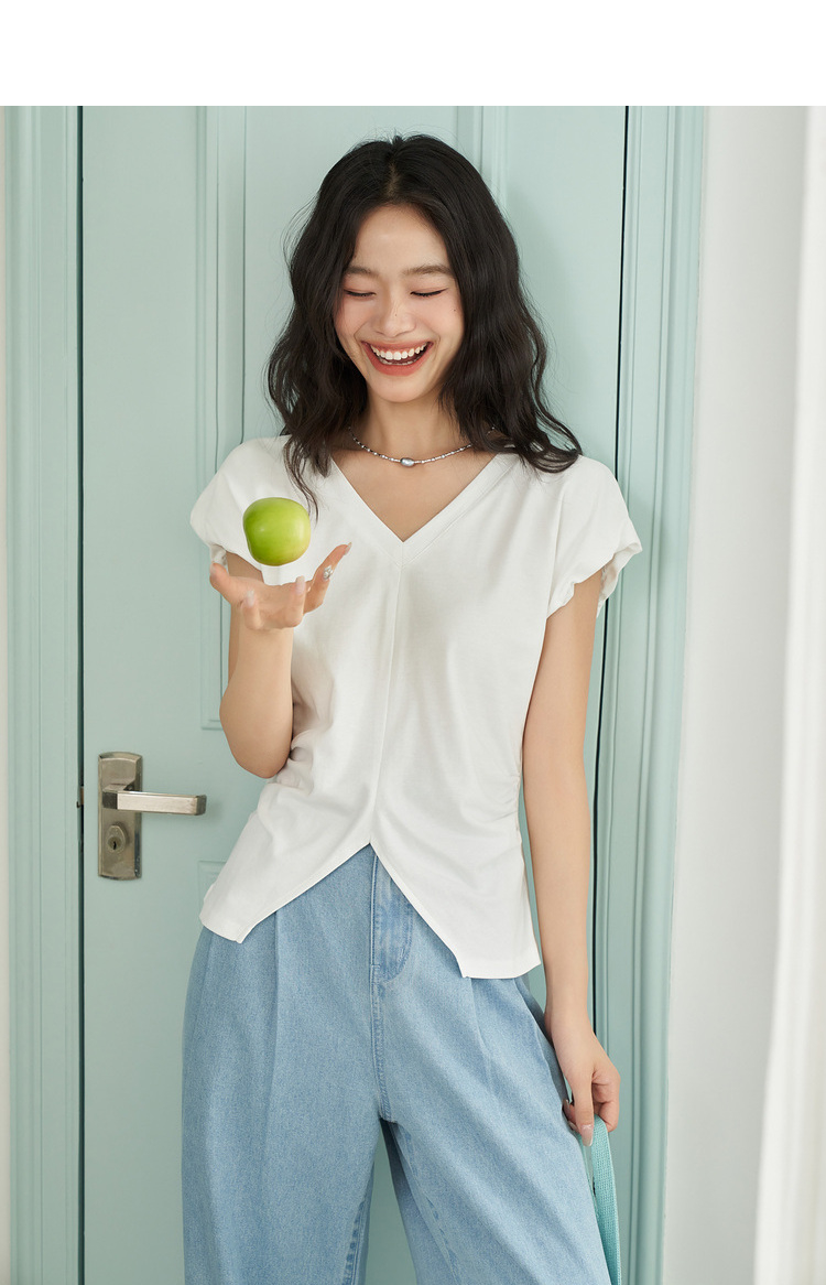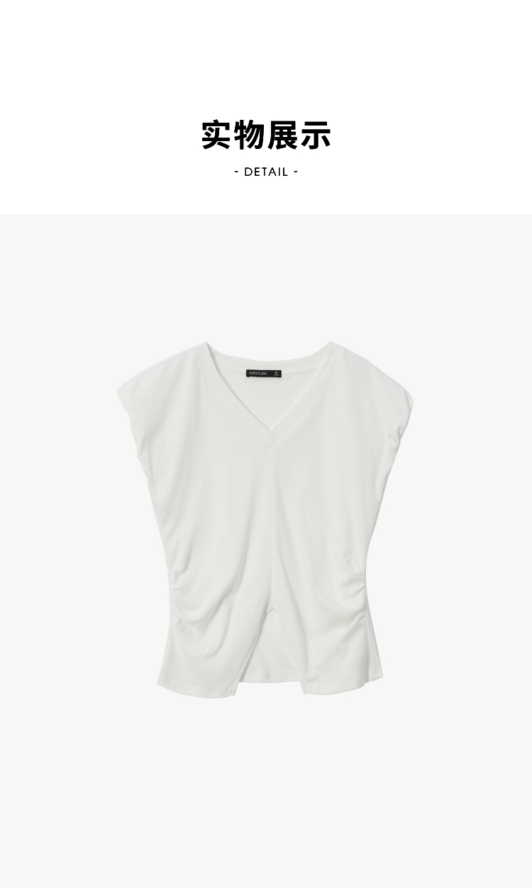 简约百搭设计感前开叉小飞袖T恤女夏季抽褶收腰T恤背心V1741404