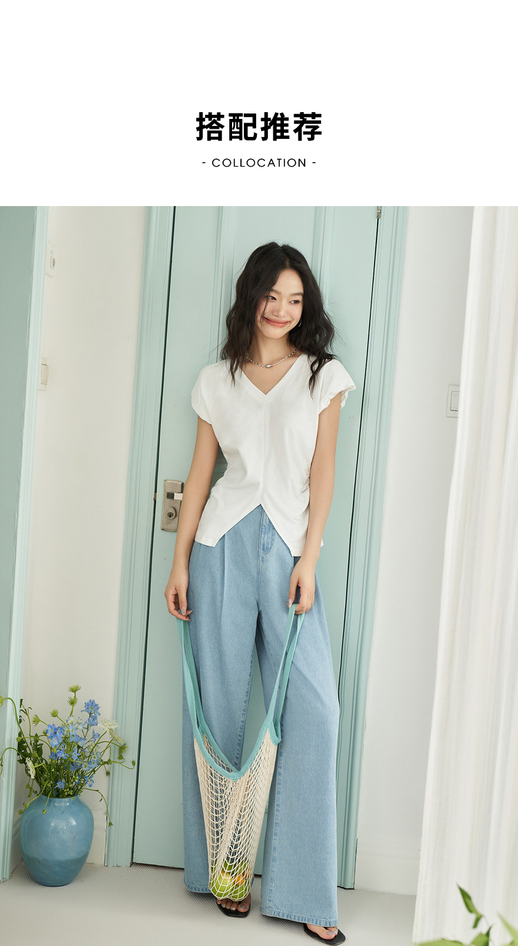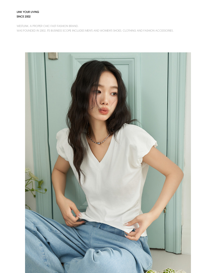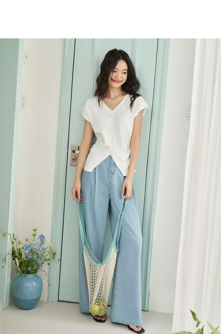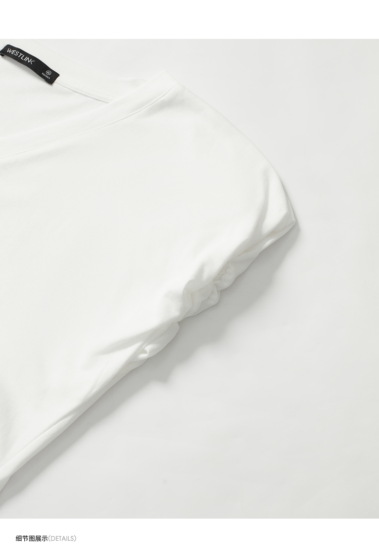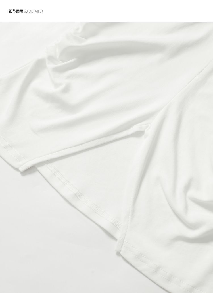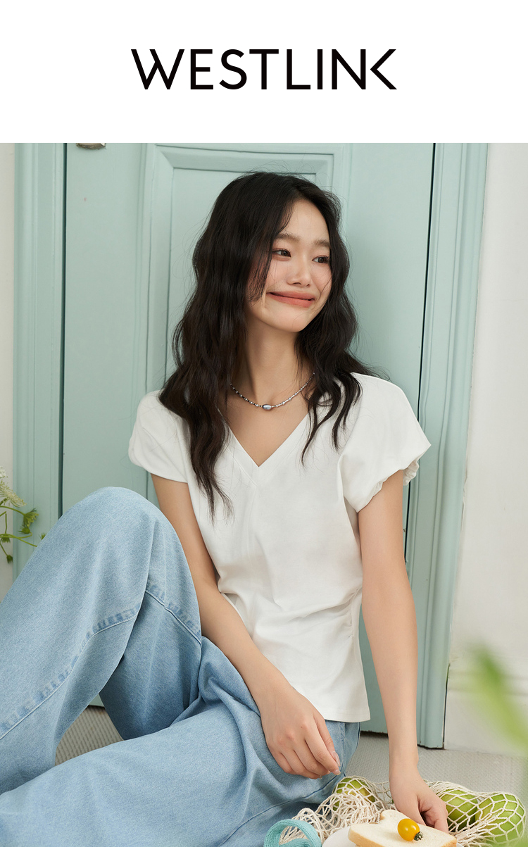 简约百搭设计感前开叉小飞袖T恤女夏季抽褶收腰T恤背心V1741404