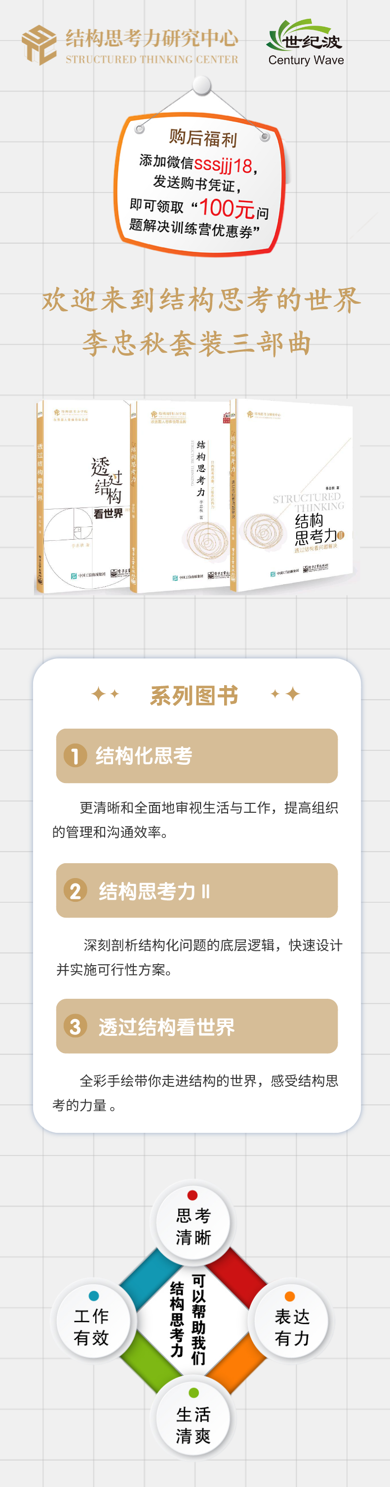 此书共3篇:**篇介绍结构思考力的原理、理论依据与基本模型。第二篇介绍结构思考力的应用。包括如何把我们对事物的认知清楚明了地呈现出来。在提升个人结构思考力的同时,使团队成员的思考力,快速形成共识,创造非凡的绩效。第三篇介绍一些实际工作中常用的结构模型工具等,使读者通过具体事物的结构分析,把理论学习与实践体验结合起来,在应用中掌握结构思考力的方法。