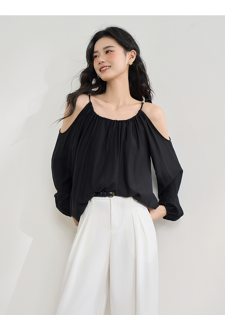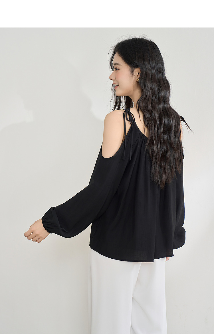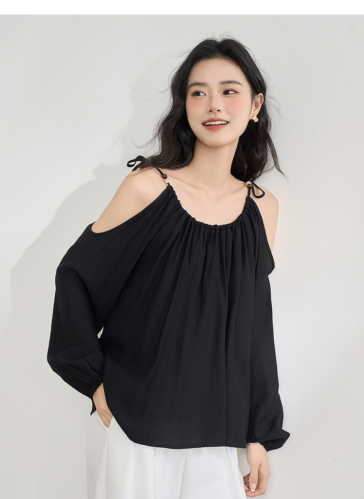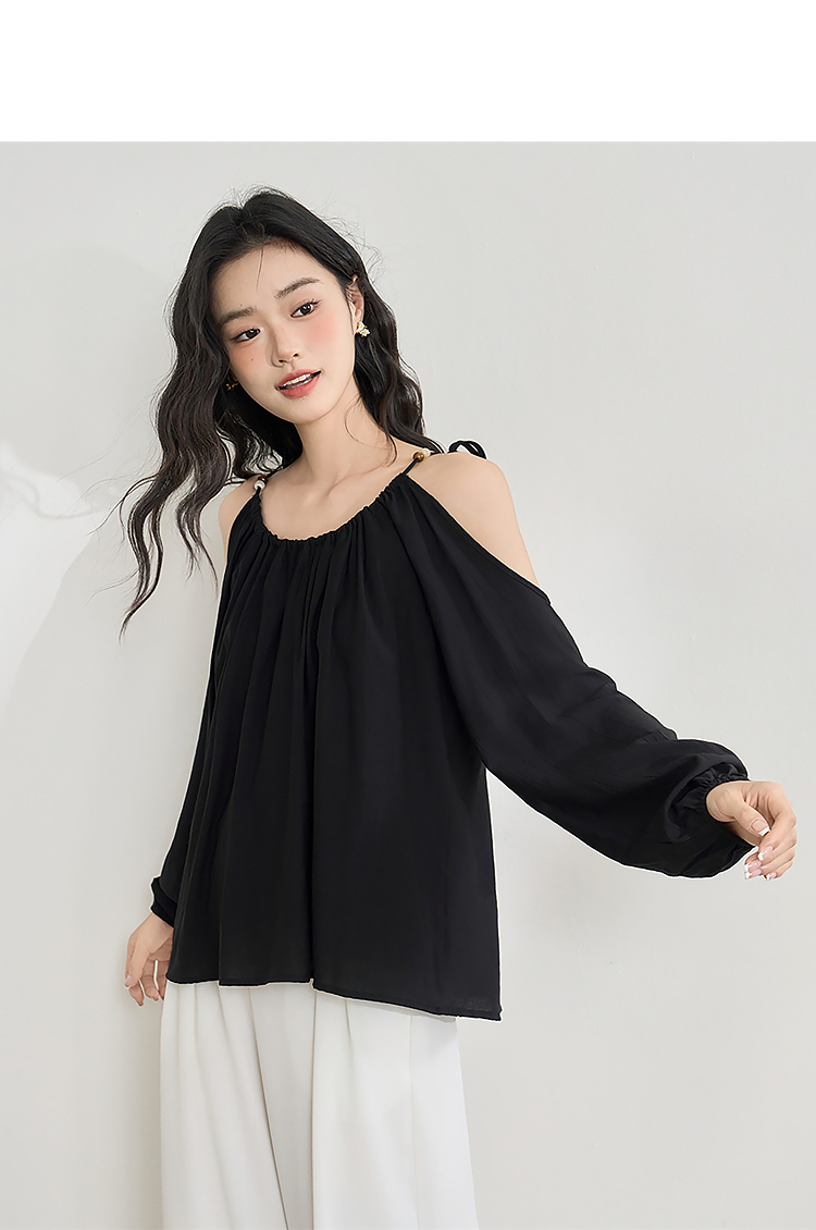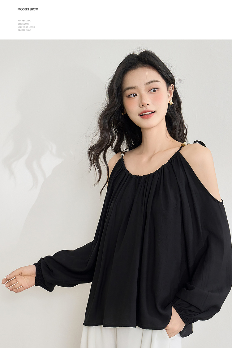 【限时秒杀】复古设计感串珠露肩吊带长袖衬衫女春季简约宽松衬衣LXD50270