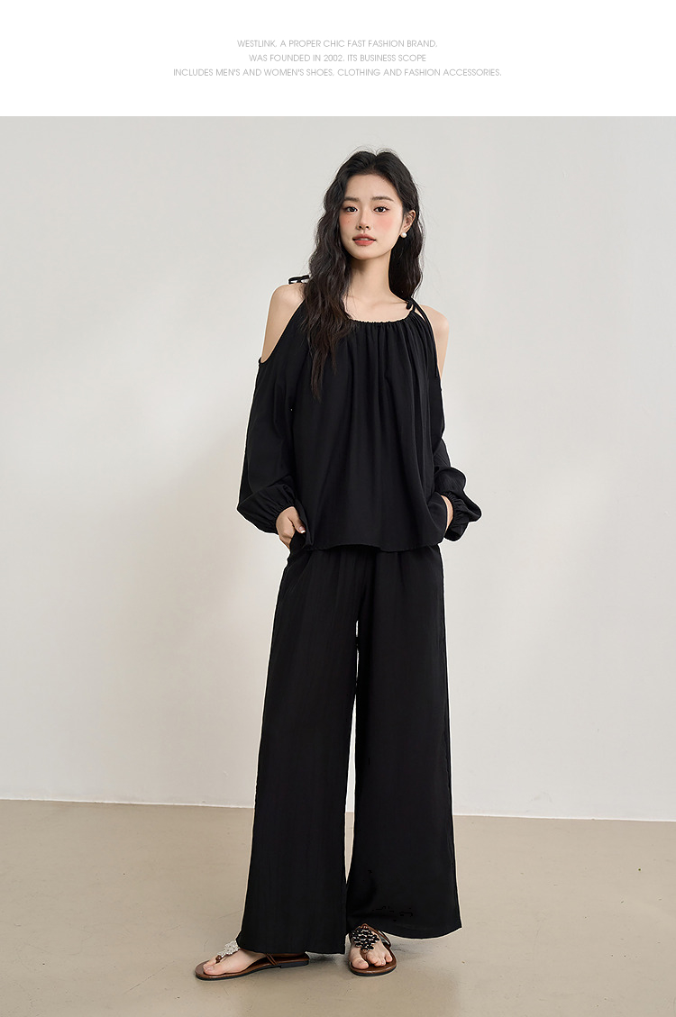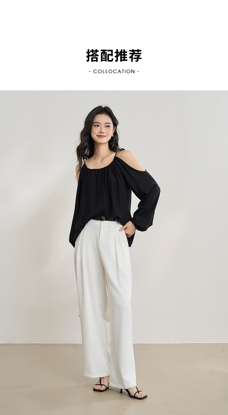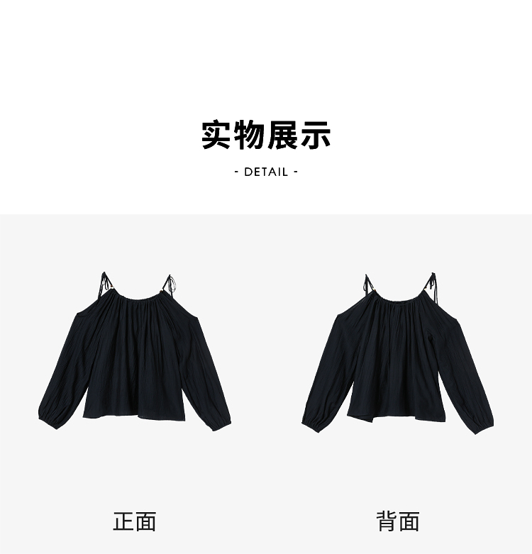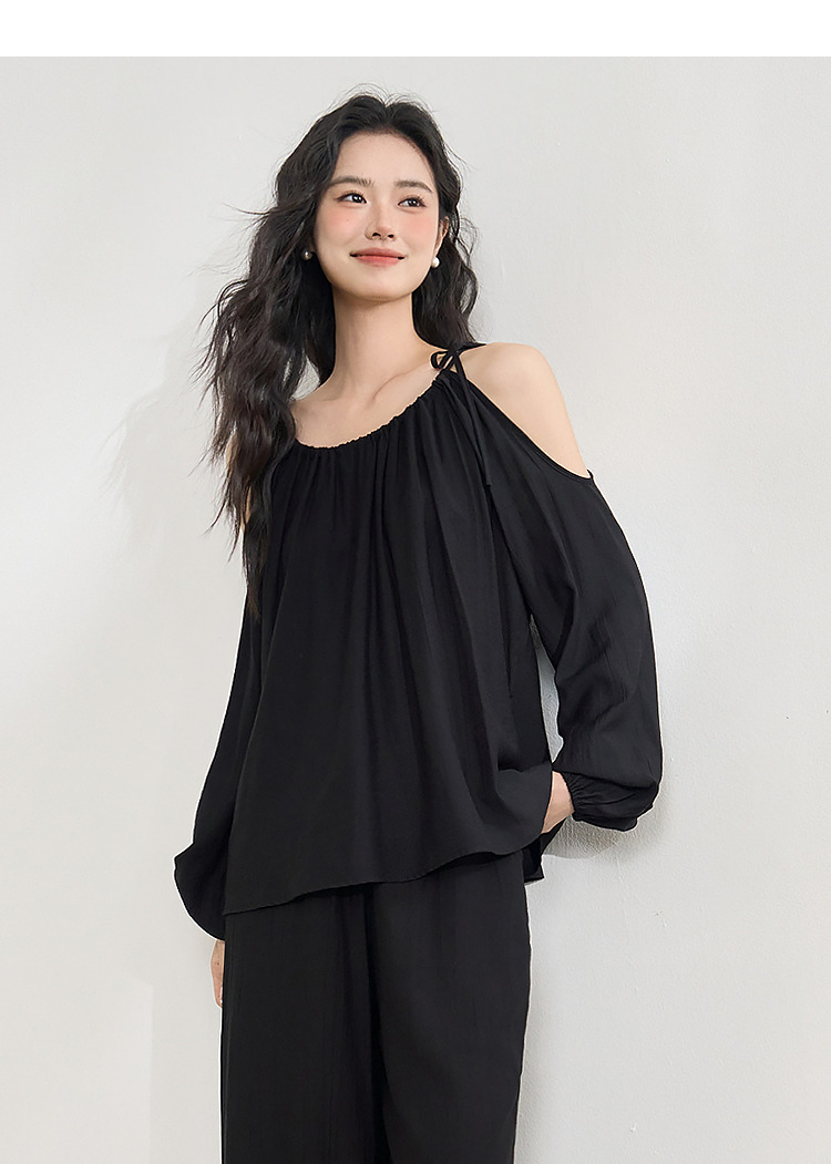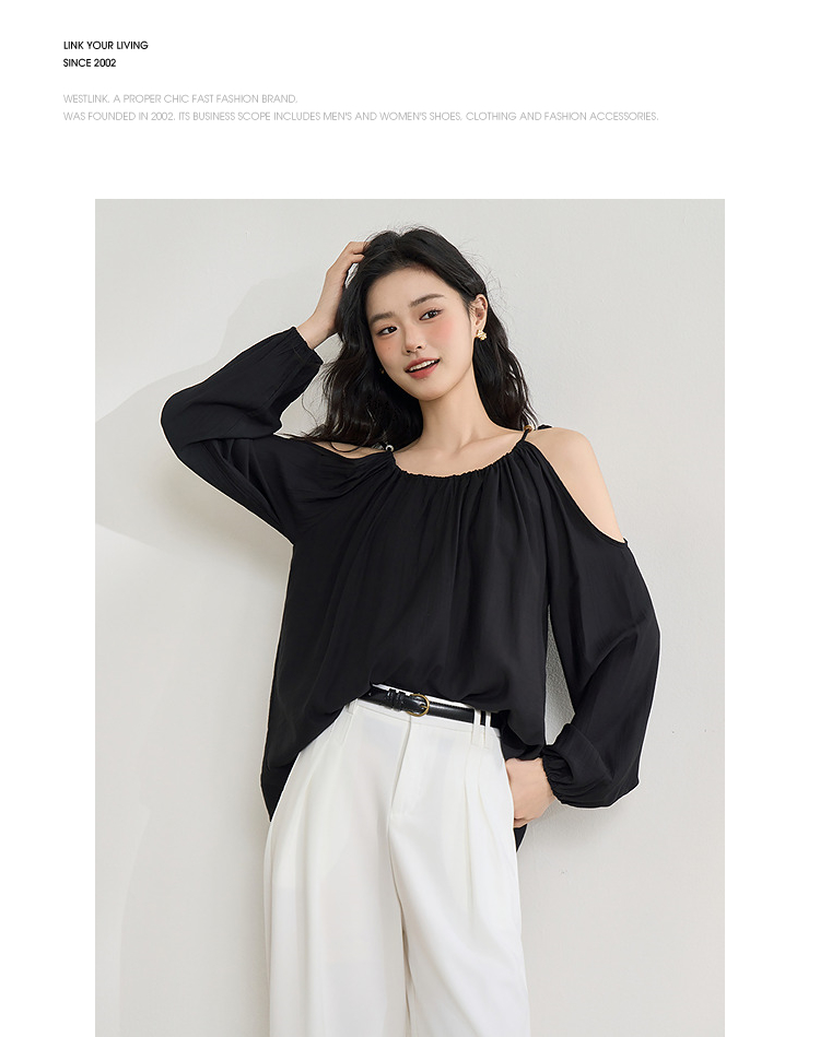 【限时秒杀】复古设计感串珠露肩吊带长袖衬衫女春季简约宽松衬衣LXD50270