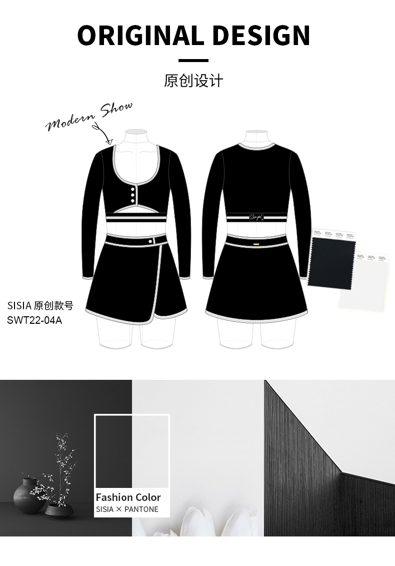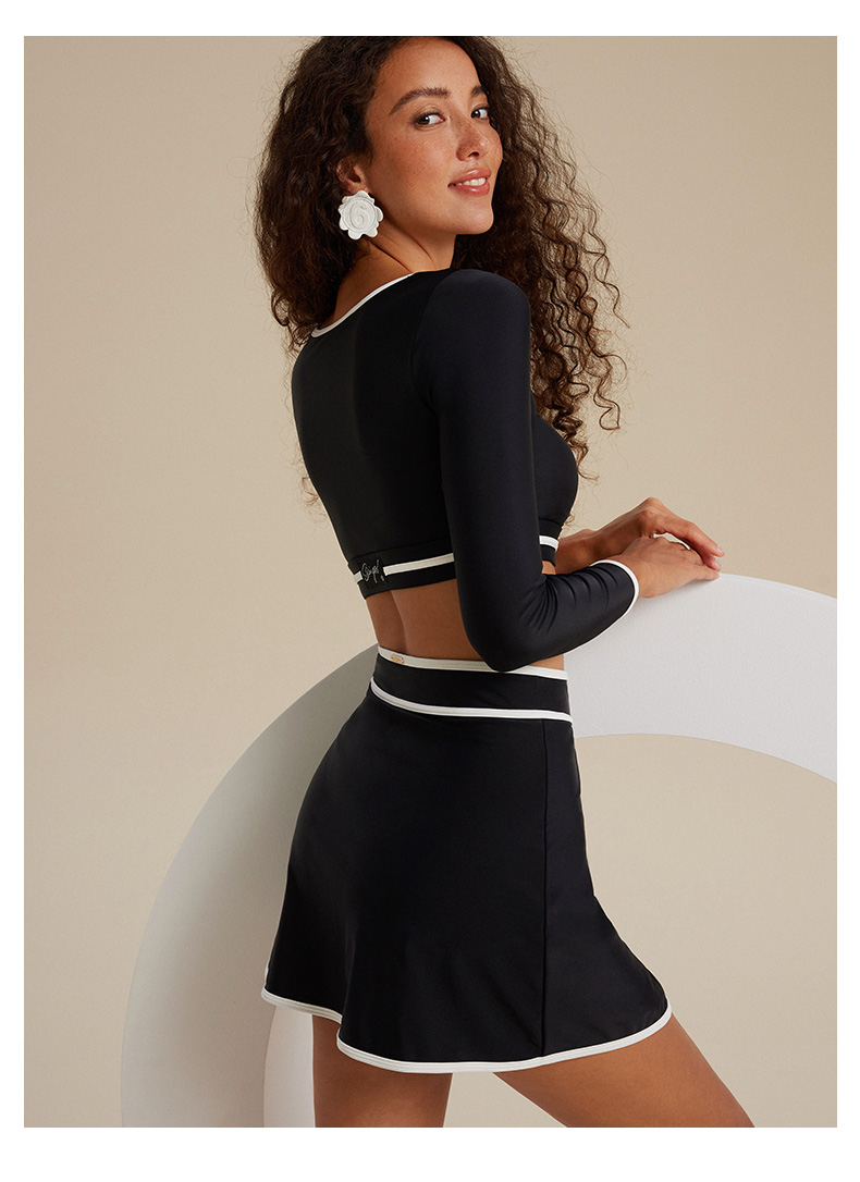 sisia新款泳衣女黑色长袖性感显瘦黑白撞色裙式分体温泉泳衣