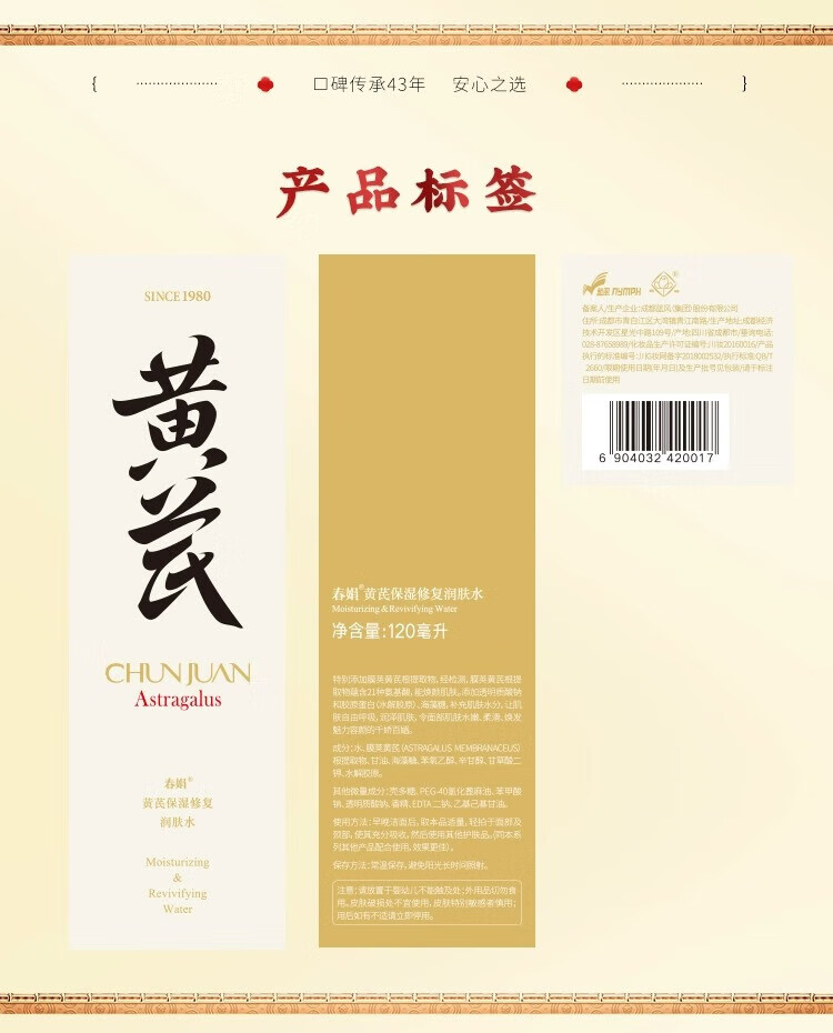 春娟-黄芪保湿-修复润肤水 120g