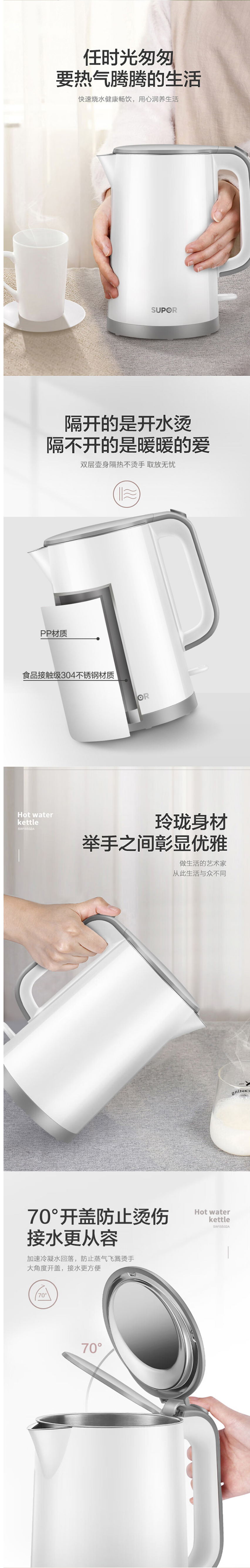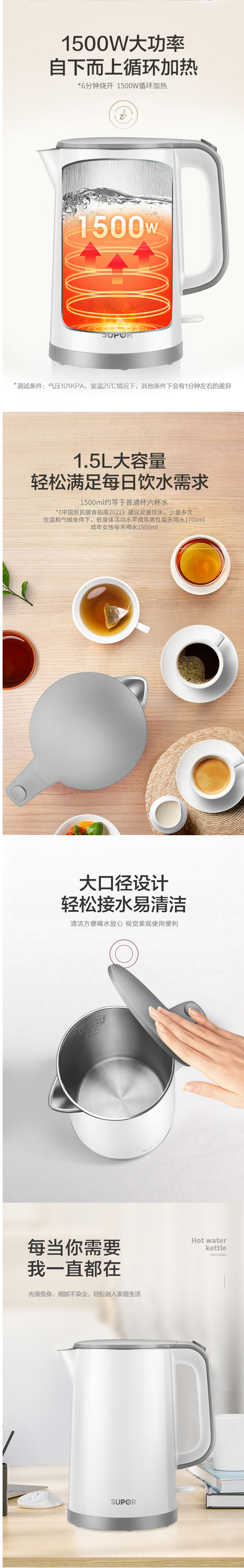 苏泊尔(SUPOR)ZMD安心系列 304不锈钢无缝内胆 双层隔热壶壁 1500W快速沸腾 1.5L容量电水壶SW-15E02A 京东万商(仅限保定地区发货)