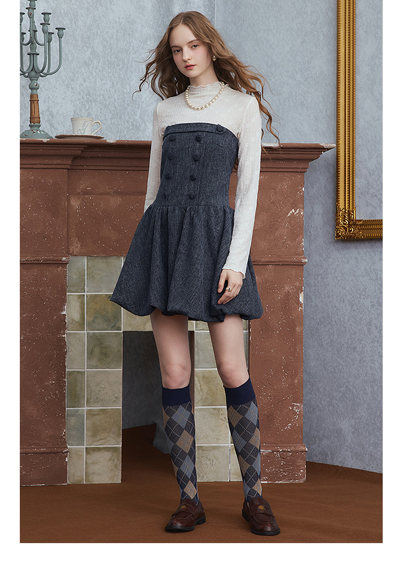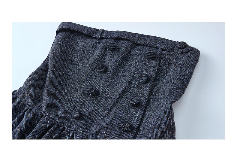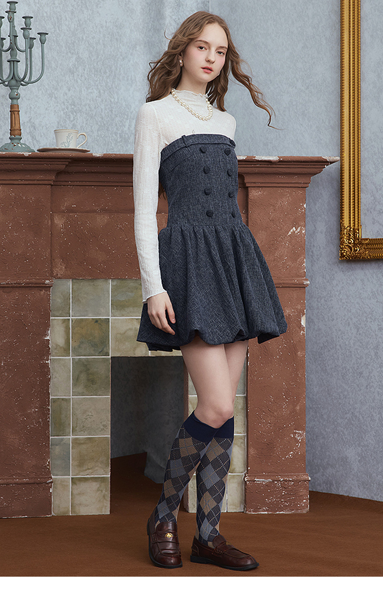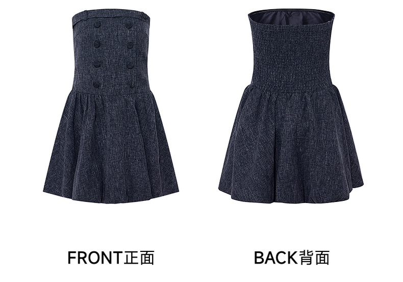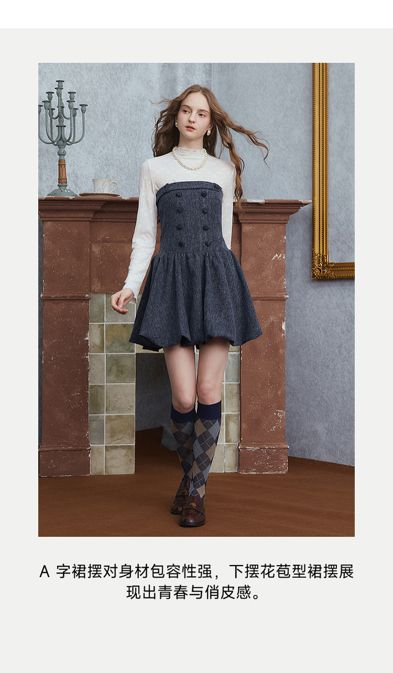 两三事灰调舞曲2025秋季新款性感纽扣装饰抹胸式短裙粗花呢连衣裙