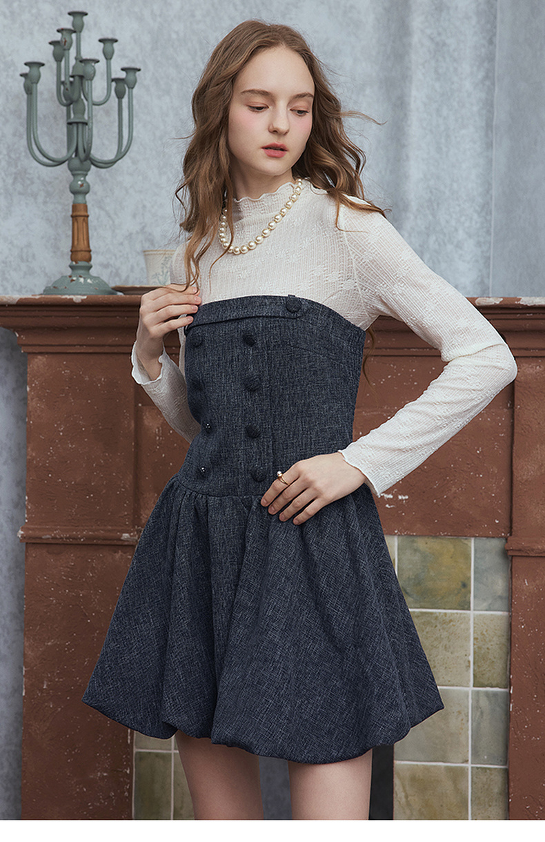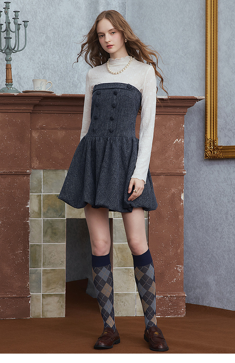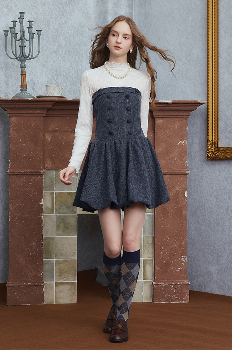 两三事灰调舞曲2025秋季新款性感纽扣装饰抹胸式短裙粗花呢连衣裙