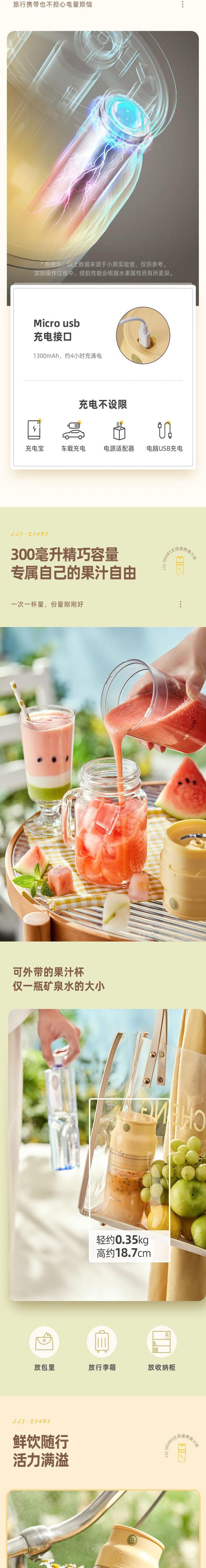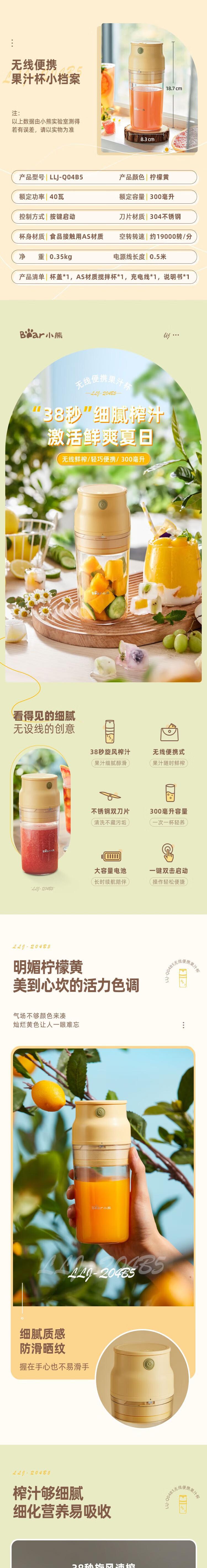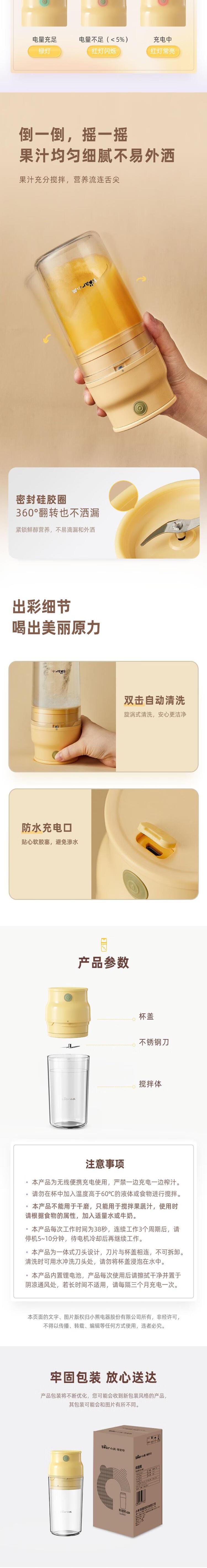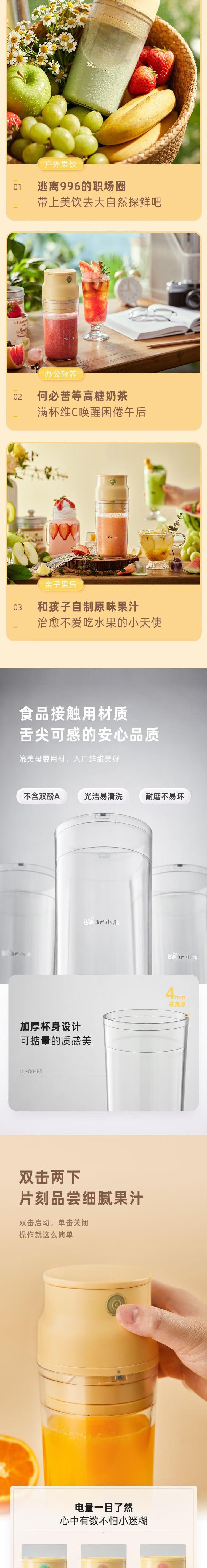【自营】小熊(Bear)迷你榨汁机 LLJ-Q04B5便携随行杯无线充电式鲜榨果肉细腻易清洗