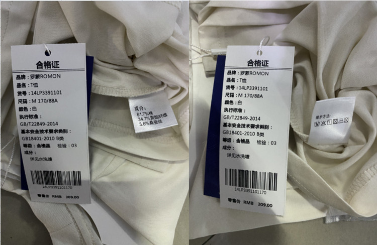 面料:61.7%棉 34.7%聚酯纤维 3.6%桑蚕丝
